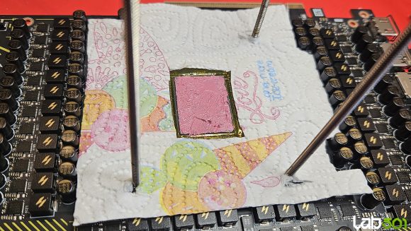 Aerul este cel mai mare dusman al condensului, prin urmare am incercat sa-l elimin cat mai eficient, decupand un strat izolator si pozitionandu-l in jurul GPU-ului. Peste acesta am asezat un strat de hartie, contactul fiind perfect, dupa care am aplicat pasta termica Kryonaut Extreme pe GPU. Prinderea waterblock-ului s-a potrivit perfect.