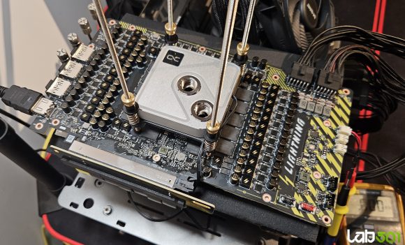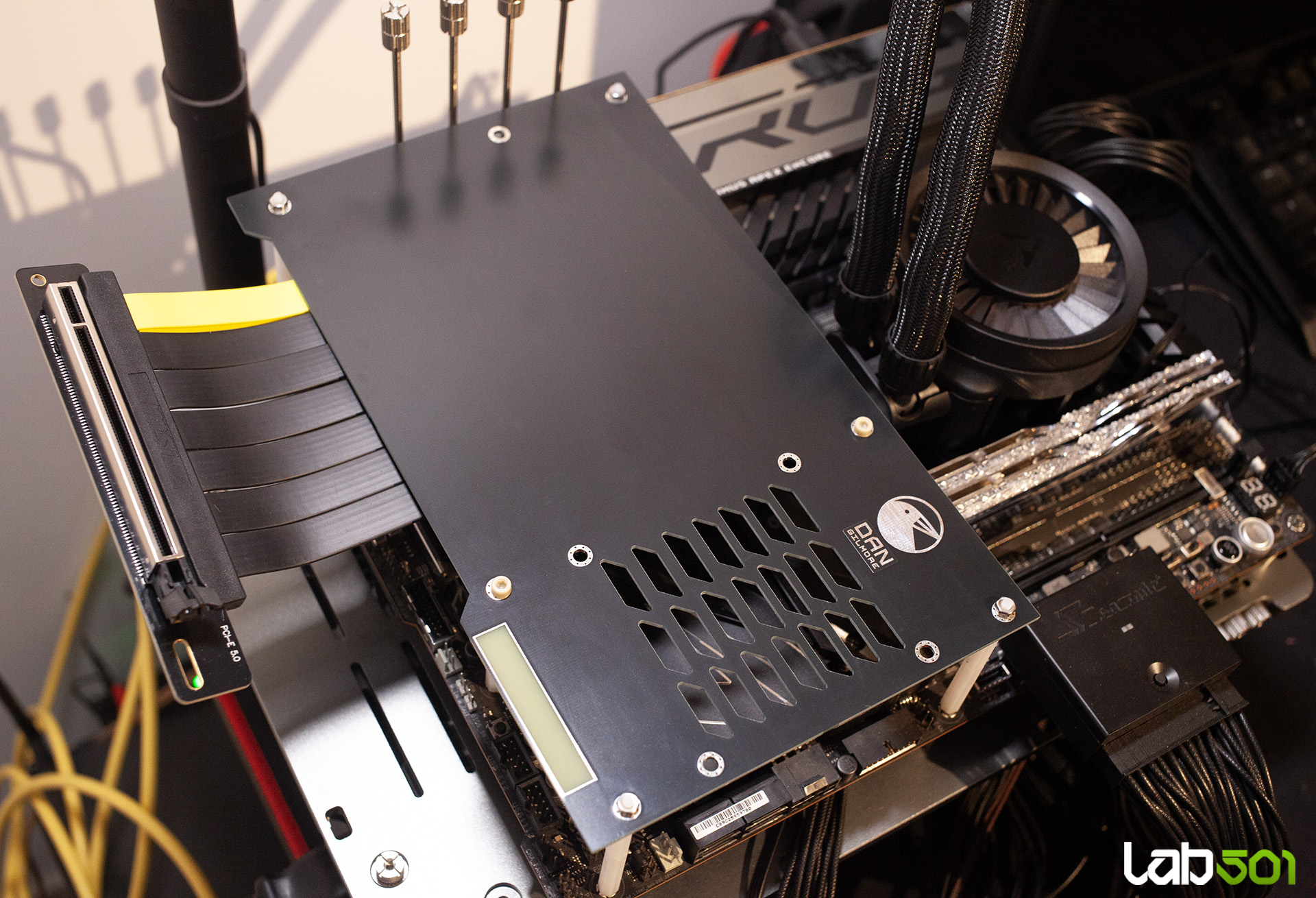 Pentru o utilizare mai facila, dar si pentru ca planuiam sa folosim un tub de LN2 destinat procesoarelor pe o placa video, am optat si pentru achizitia unui stand orizontal pentru GPU-uri de la Dan Gilmore. Acest lucru a implicat utilizarea unui riser PCI Express 5.0 pentru montarea placii in pozitie orizontala – din fericire, MSI au inclus unul de calitate in pachetul lui RTX 5090 32G LIGHTNING Z.