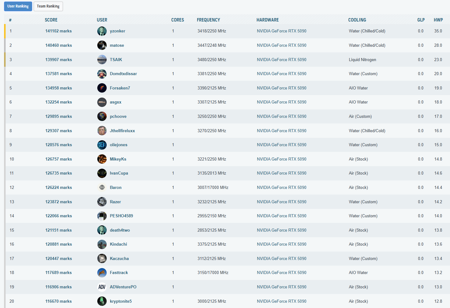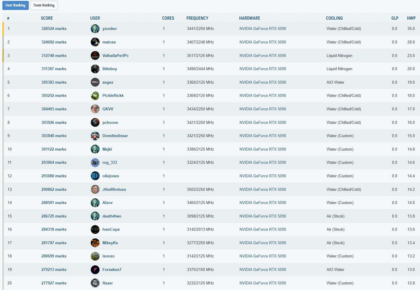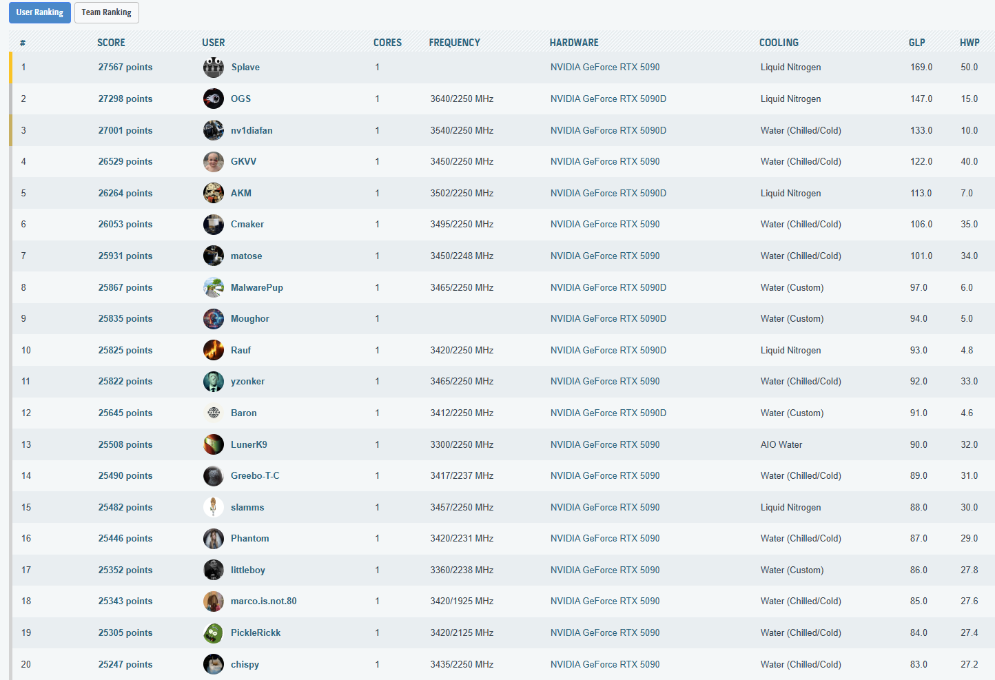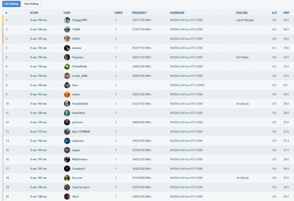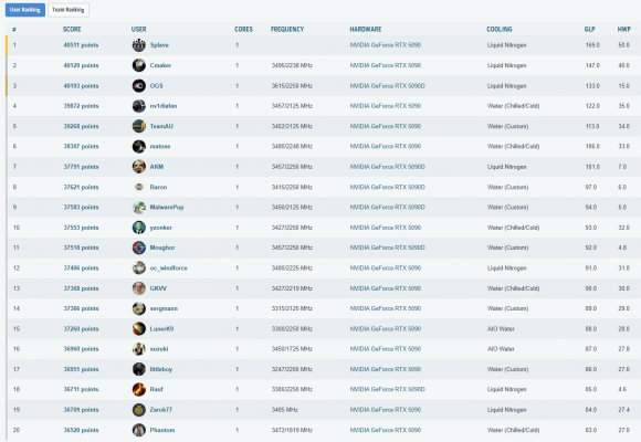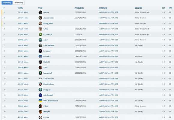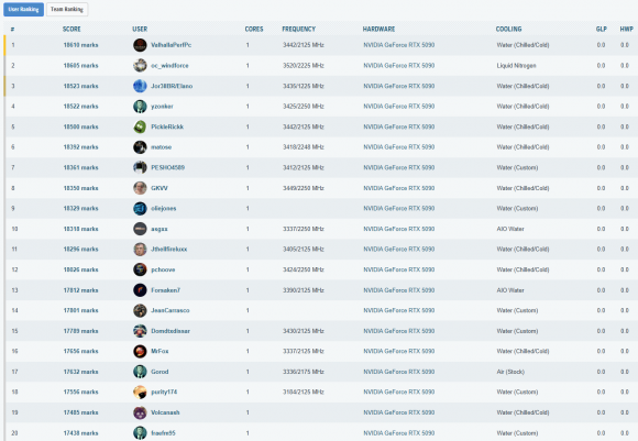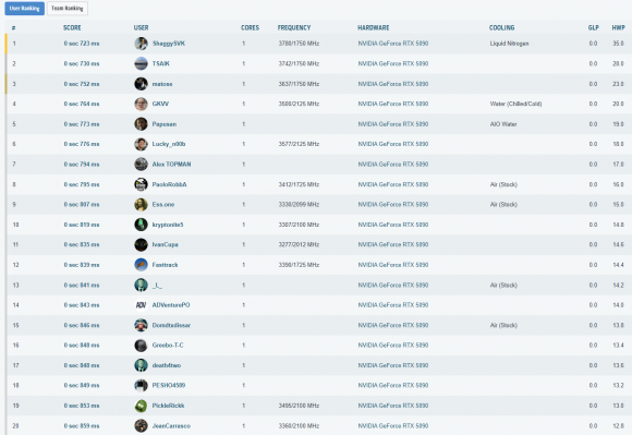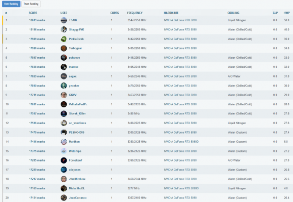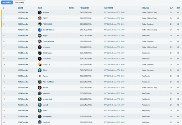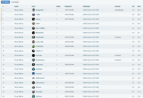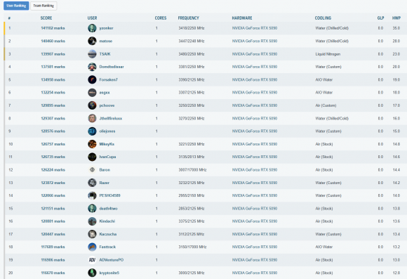Cele mai importante rezultate, din punct de vedere al clasarii, obtinute in aceasta etapa a testelor sunt listate in cele ce urmeaza. La finalul paginii puteti vedea toate rezultatele inregistrate, impreuna cu clasamentul din acel moment – unul destul de spectaculos, as putea spune, mai ales ca, folosind doar un „simplu” chiller, am reusit sa depasim numeroase rezultate cu RTX 5090 (inclusiv Lightning Z) obtinute pe LN2!