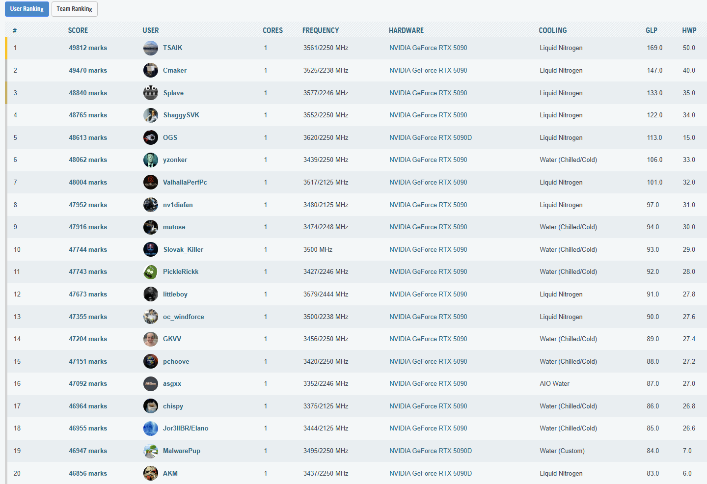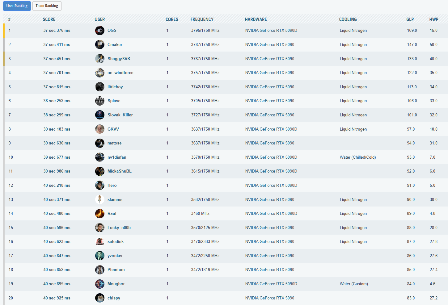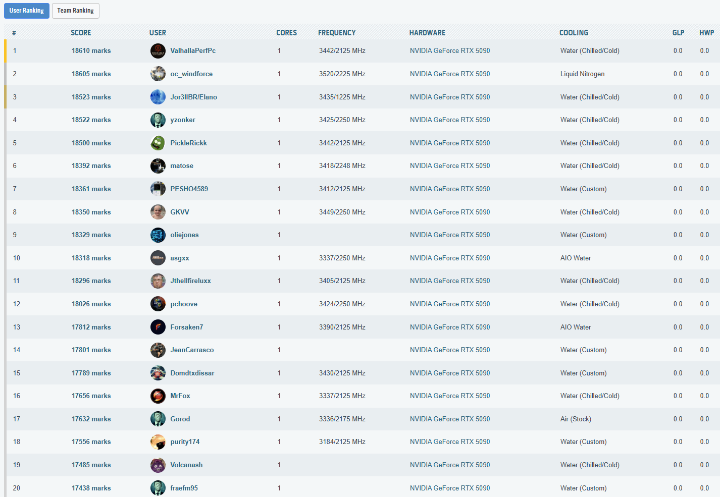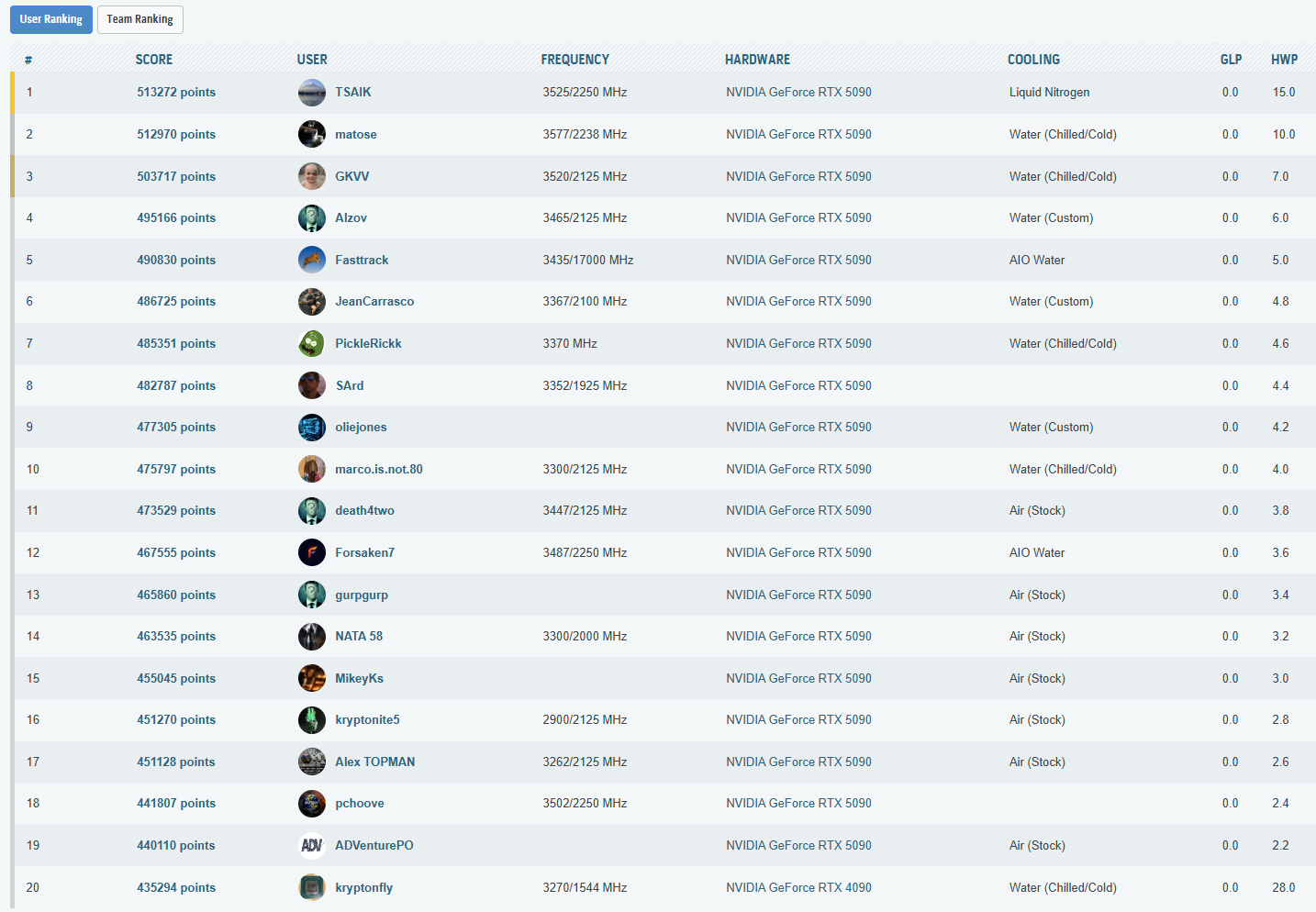 Cele mai importante rezultate, din punct de vedere al clasarii, obtinute in aceasta etapa a testelor sunt listate in cele ce urmeaza. La finalul paginii puteti vedea toate rezultatele inregistrate, impreuna cu clasamentul din acel moment – unul destul de spectaculos, as putea spune, mai ales ca, folosind doar un „simplu” chiller, am reusit sa depasim numeroase rezultate cu RTX 5090 (inclusiv Lightning Z) obtinute pe LN2!