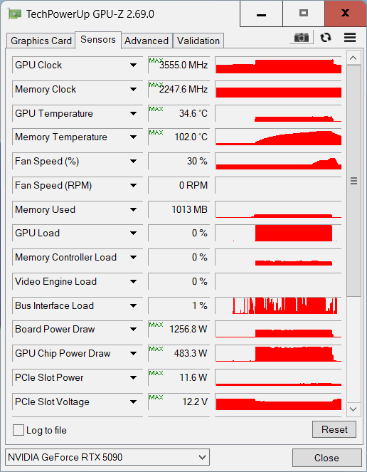 In testele 3D am atins un consum de 1257 W si o temperatura maxima a GPU-ului de 34.6°C, asa cum puteti vedea si in screenshot-ul de mai jos, in conditiile in care apa din circuit avea o temperatura de aproximativ 0°C. Prin urmare, Alphacool Core 1 Aurora se dovedeste a fi un waterblock excelent si pentru placi grafice high-end.