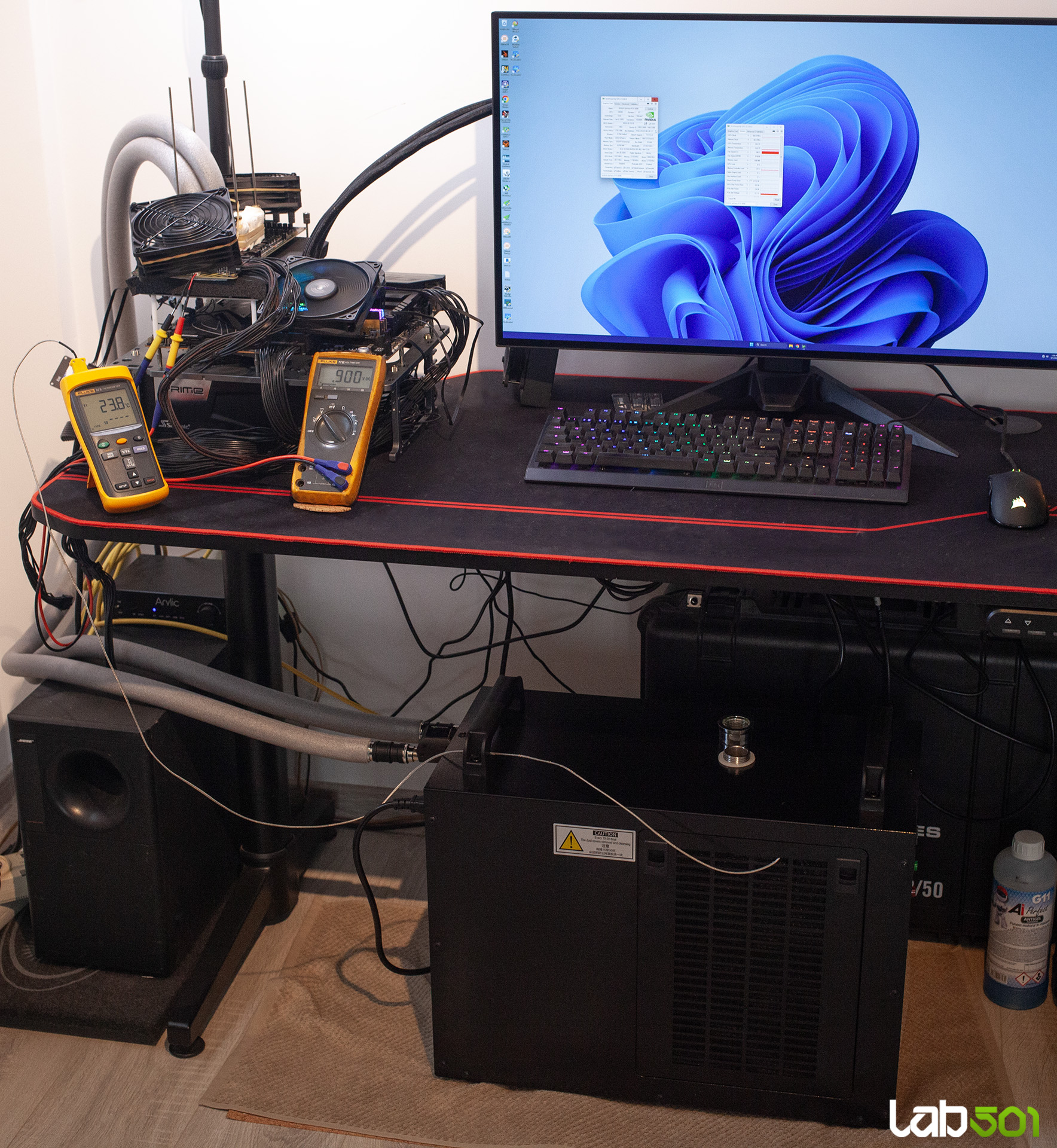 Prima data am pornit chiller-ul si am urmarit mentinerea contactului waterblock-ului cu GPU-ul in parametri. Dupa ce am confirmat ca totul este in regula, am setat chiller-ul in modul de temperatura constanta, cu un target de -5°C, valoare atinsa in aproximativ 20 de minute si mentinuta fara probleme in benchmark-urile de tip compute, care sunt scurte si nu genereaza un TDP foarte ridicat.