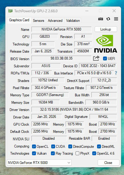 | NVIDIA GeForce RTX 5080 | GIGABYTE GeForce RTX 5080 Gaming OC 16G | ASUS GeForce RTX 5080 Noctua Edition | ASUS ROG Astral GeForce RTX 5080 | NVIDIA GeForce RTX 5090 | |