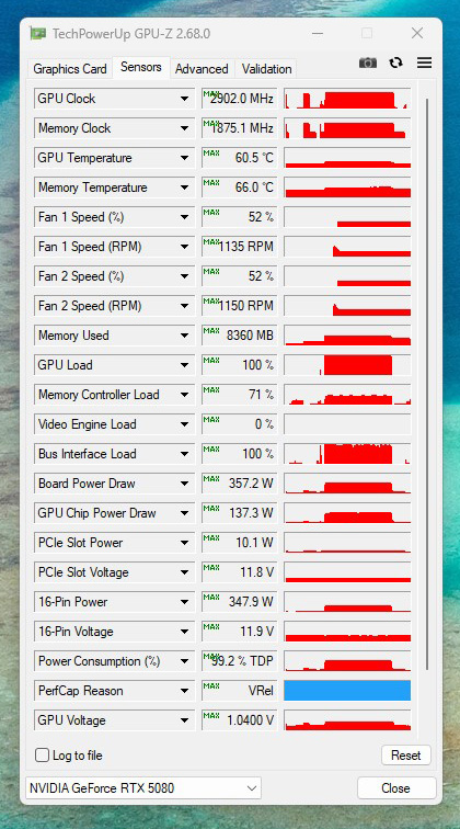 ASUS GeForce RTX 5080 Noctua Edition are nucleul grafic tactat la o frecventa de baza de 2295MHz, frecventa de boost declarata fiind de 2700 MHz, aceasta putand fi setata la 2730MHz cu ajutorul aplicatiei ASUS GPU Tweak III. Memoria RAM ruleaza la 1875MHz, comunicand cu nucleul grafic printr-o magistrala de 256 bit.