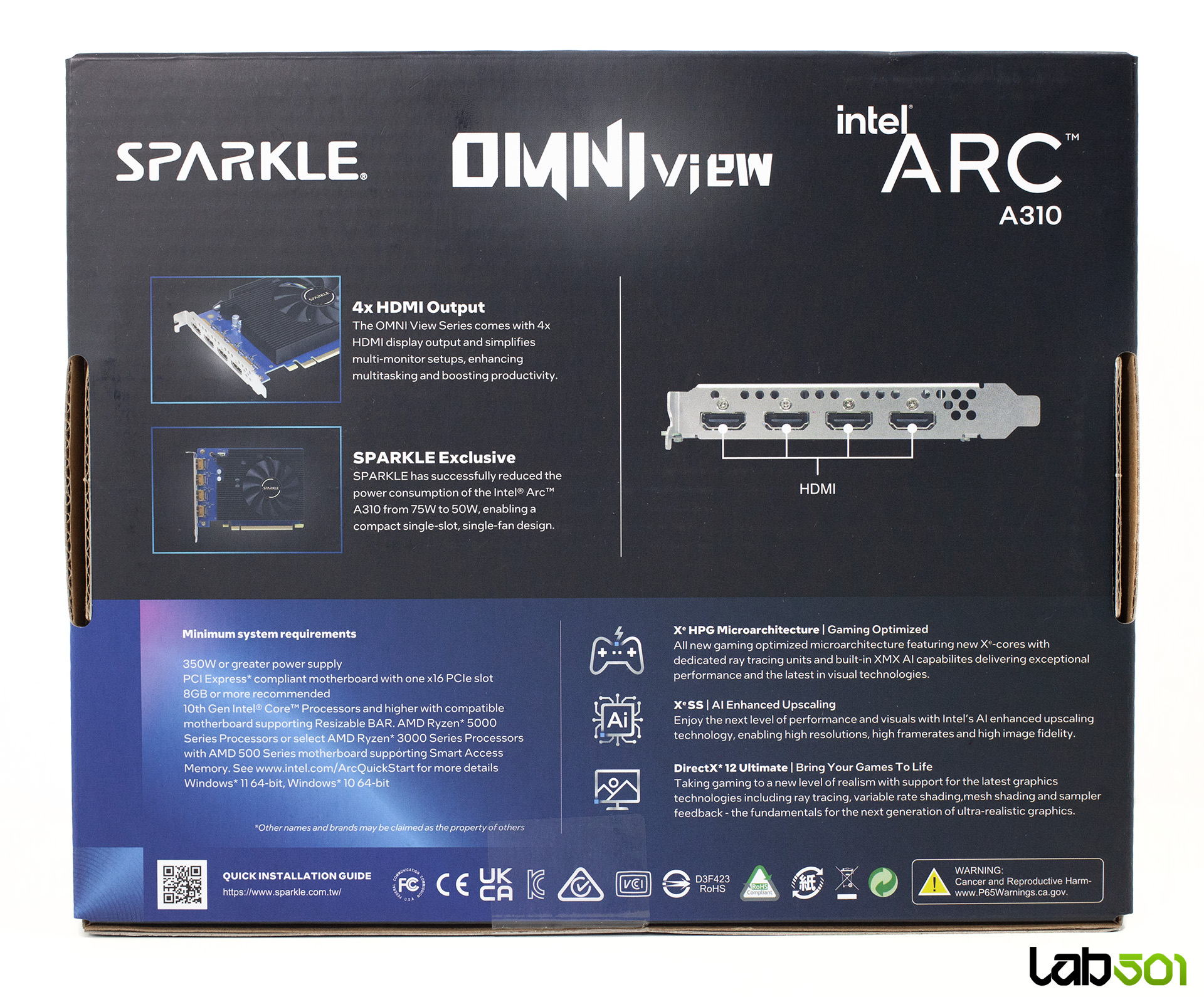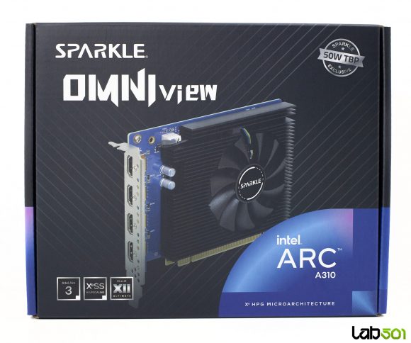 Placa video este livrata in ambalajul standard al producatorului, in interior fiind inclusa placa video, protejata corespunzator impotriva socurilor si descarcarilor electrostatice. SPARKLE Intel Arc A310 OMNI View adopta o arhitectura single-slot eleganta, fiind echipata cu un singur ventilator si un radiator generos din aluminiu, care acopera aproape intreaga suprafata frontala a PCB-ului. Putem spune ca SPARKLE au gasit un echilibru reusit intre performanta termica si dimensiuni – Arc A310 OMNI View reuseste sa se mentina suficient de rece si relativ silentios in regim de functionare continua (24/7), fara a compromite functionalitatea.