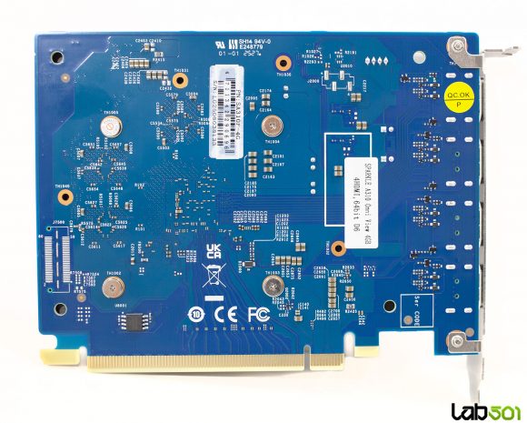 Nu exista conectori de alimentare suplimentari, placa fiind alimentata exclusiv prin slotul PCIe, lucru care simplifica cable management-ul si permite utilizarea in sisteme cu surse de putere modesta. Din punct de vedere al conectivitatii, OMNI View iese imediat in evidenta prin cele patru porturi HDMI 2.0b amplasate pe panoul I/O. Trecerea la OMNI View a necesitat un PCB revizuit si un layout diferit, pentru a putea acomoda cele patru iesiri HDMI de dimensiune standard, dispuse eficient pe un singur bracket.