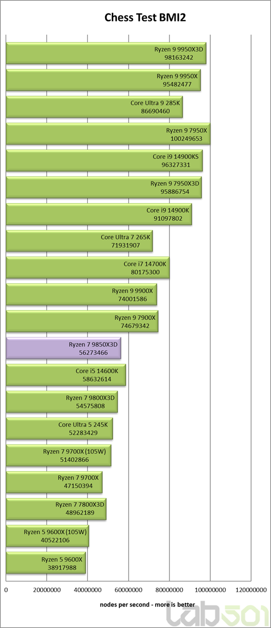Chess Test este un test multi-thread intens unde Ryzen 7 9850X3D este din nou marginal mai rapid decat 9800X3D, situatie pe care am intalnit-o des de-a lungul testelor.
