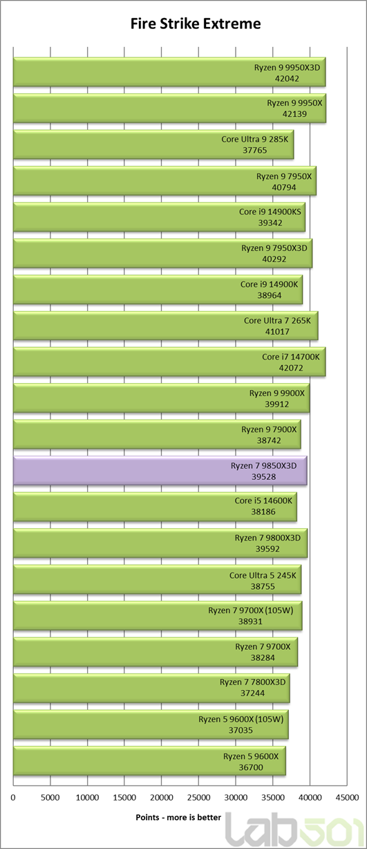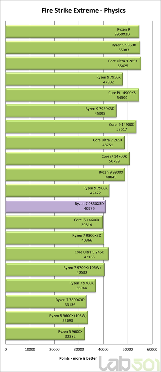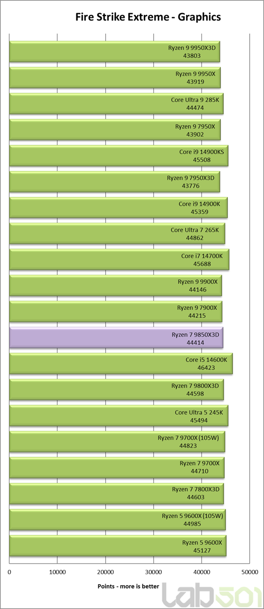 In 3DMark FireStrike Extreme intram treptat in domeniul unde Ryzen 7 9850X3D se simte cu adevarat in largul lui: gaming-ul. Aici ne intereseaza in mod special scorul Physics, unde observam ca 9850X3D inregistreaza un avans de aproximativ 1.5%, diferenta care poate fi considerata minima.