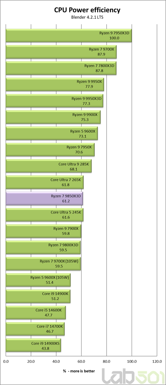Asa cum ne asteptam, rezultatele confirma ceea ce banuiam deja: in segmentul procesoarelor cu 8 nuclee, Ryzen 7 9700X, Ryzen 7 7800X3D si Ryzen 7 7700 conduc detasat atunci cand vorbim de eficienta energetica. Cresterea consumului mediu cu aproximativ 80% fata de cel masurat la 7800X3D plaseaza Ryzen 7 9800X3D si 9850X3D in cea de-a doua jumatate a clasamentului, acestea nefiind cele mai potrivite optiuni daca eficienta energetica in aplicatii de productivitate reprezinta un criteriu prioritar.