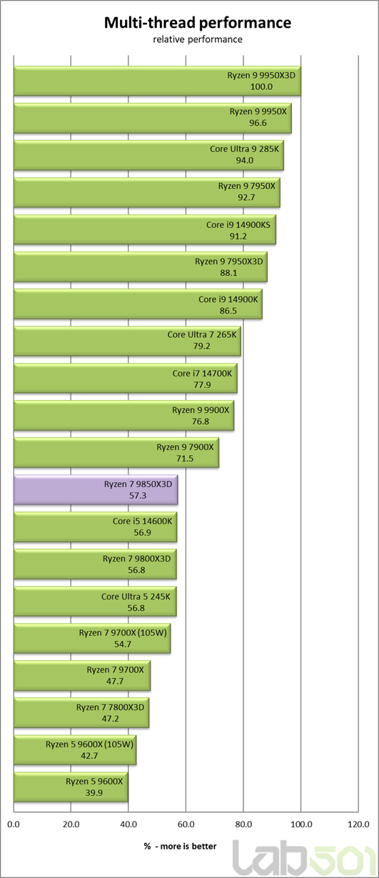 Pentru a putea sumariza mai bine performanta procesoarelor, am decis introducerea a doua grafice care ne arata performanta relativa a tuturor celor 20 de procesoare testate in review-ul de astazi. In graficul dedicat scenariilor single-thread, luam in calcul rezultatele benchmark-urilor din Cinebench (R23 si 2024) si POV-Ray, scalate procentual fata de cel mai rapid procesor. Observam ca AMD Ryzen 7 9850X3D se situeaza in prima jumatate a clasamentului, cu un castig de aproximativ 6% comparativ cu 9800X3D, lucru normal avand in vedere cei 400 MHz extra adaugati la boost.