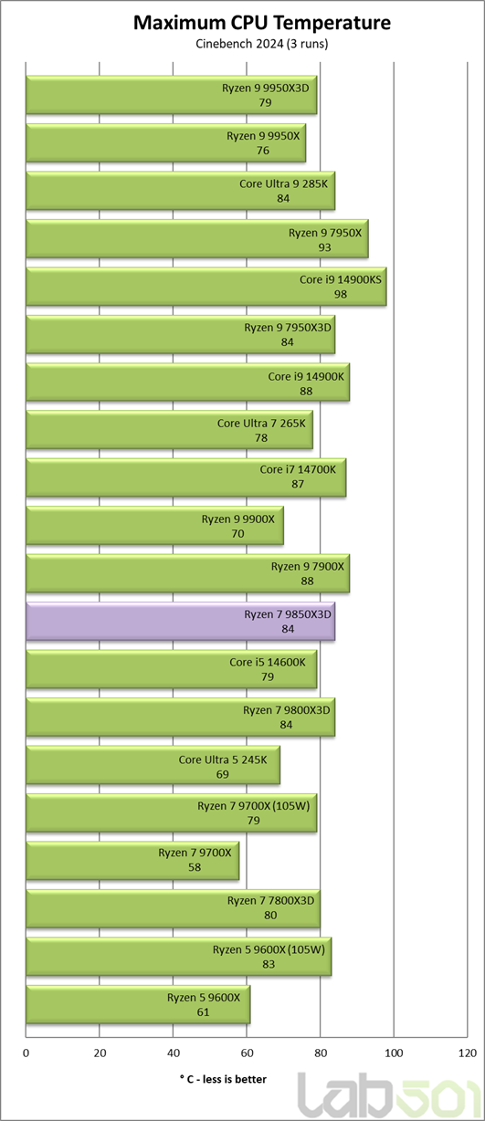 Asa cum era de asteptat, avand in vedere consumul mediu aproape identic, Ryzen 7 9850X3D si 9800X3D ating aceeasi temperatura maxima, respectiv 84°C. La un TDP de 120W, in practica, este suficient un cooler high-end pe aer sau un AIO de 240 mm pentru racirea corespunzatoare.