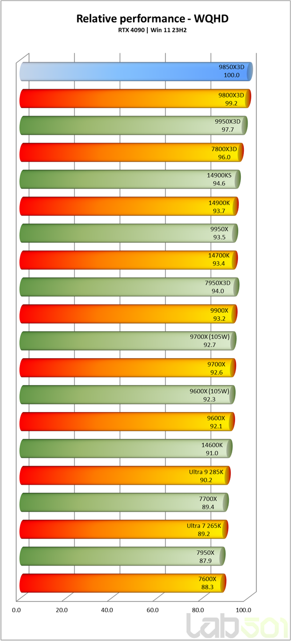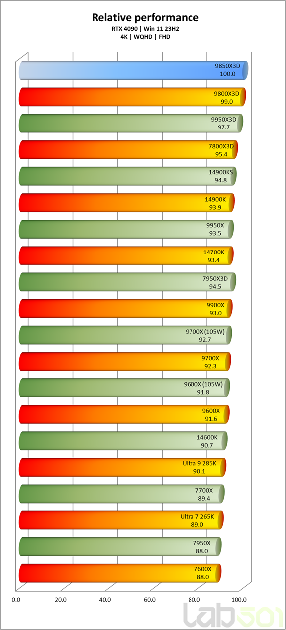 Daca analizam separat pe rezolutii, observam ca in gaming la 4K noul Ryzen 7 9850X3D este doar marginal mai rapid decat 9800X3D, ramanand totusi in urma modelelor Core i5, i7 si i9 din generatia anterioara. Coborand rezolutia la WQHD si FHD, Ryzen 7 9850X3D incepe insa sa se desprinda clar, fara nici un dubiu ca avem de-a face cu cel mai rapid procesor de gaming lansat pana acum.