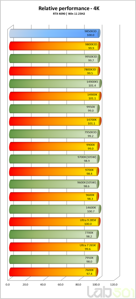 Asa cum era de asteptat, AMD Ryzen 7 9850X3D se instaleaza confortabil in fotoliul de cel mai rapid procesor de gaming, preluand coroana de la predecesorul sau, 9800X3D. Luand in considerare toate rezolutiile testate (4K, WQHD si FHD), Ryzen 7 9850X3D obtine un avans de aproximativ 1% fata de 9800X3D si aproape 5% comparativ cu Ryzen 7 7800X3D, cel mai rapid procesor de gaming al generatiei trecute.