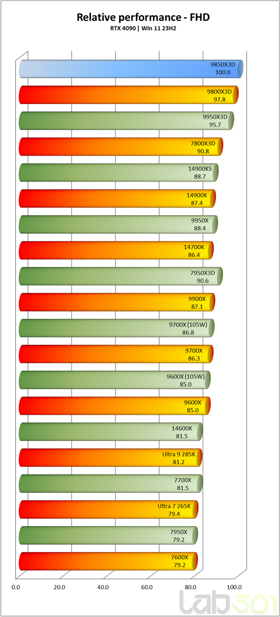 In FHD, Ryzen 7 9800X3D ramane la 2.2% in urma lui 9850X3D, in timp ce primul procesor Intel din clasament, Core i9 14900KS, se afla la 11.3% distanta – wow! Este clar ca pentru CS2 si alte jocuri eSports competitive, unde fiecare cadru poate face diferenta intre victorie si infrangere (virtuala, desigur), noul Ryzen 7 9850X3D vine exact la fix.