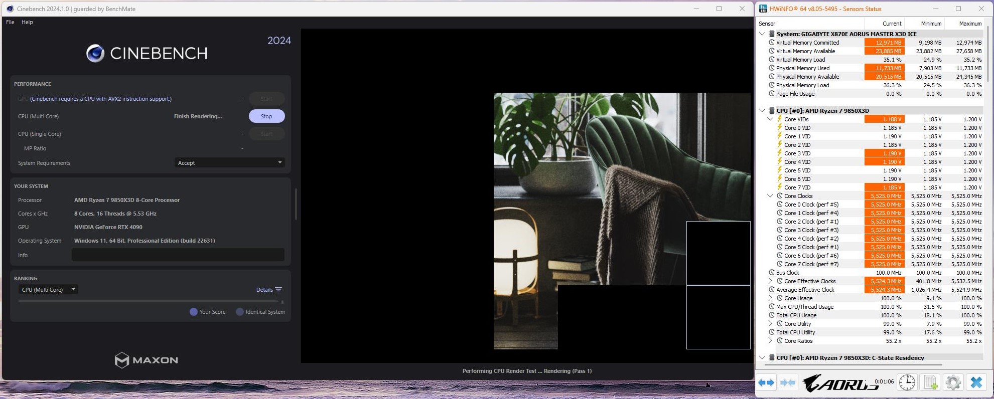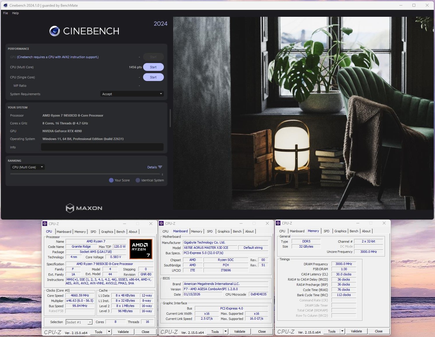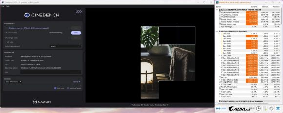 Spre deosebire de 9800X3D, unde activarea PBO nu avea practic nici un efect, mecanismul Precision Boost imbunatatit ii permite noului Ryzen 7 9850X3D sa se dezlantuie. Pentru a maximiza potentialul, am activat Curve Optimizer si am gasit valoarea -40 ca fiind setarea la care am obtinut stabilitate deplina. Rezultatul s-a tradus intr-o frecventa stabila de 5460 MHz pe toate nucleele, la o tensiune de alimentare de 1.13–1.14 V (vizibil in cel de-al doilea screenshot). In Cinebench 2024, cu noile setari am obtinut un scor de 1456 puncte (cel de-al treilea screenshot), ceea ce se traduce intr-un spor de performanta de 3.2% comparativ cu scenariul default.