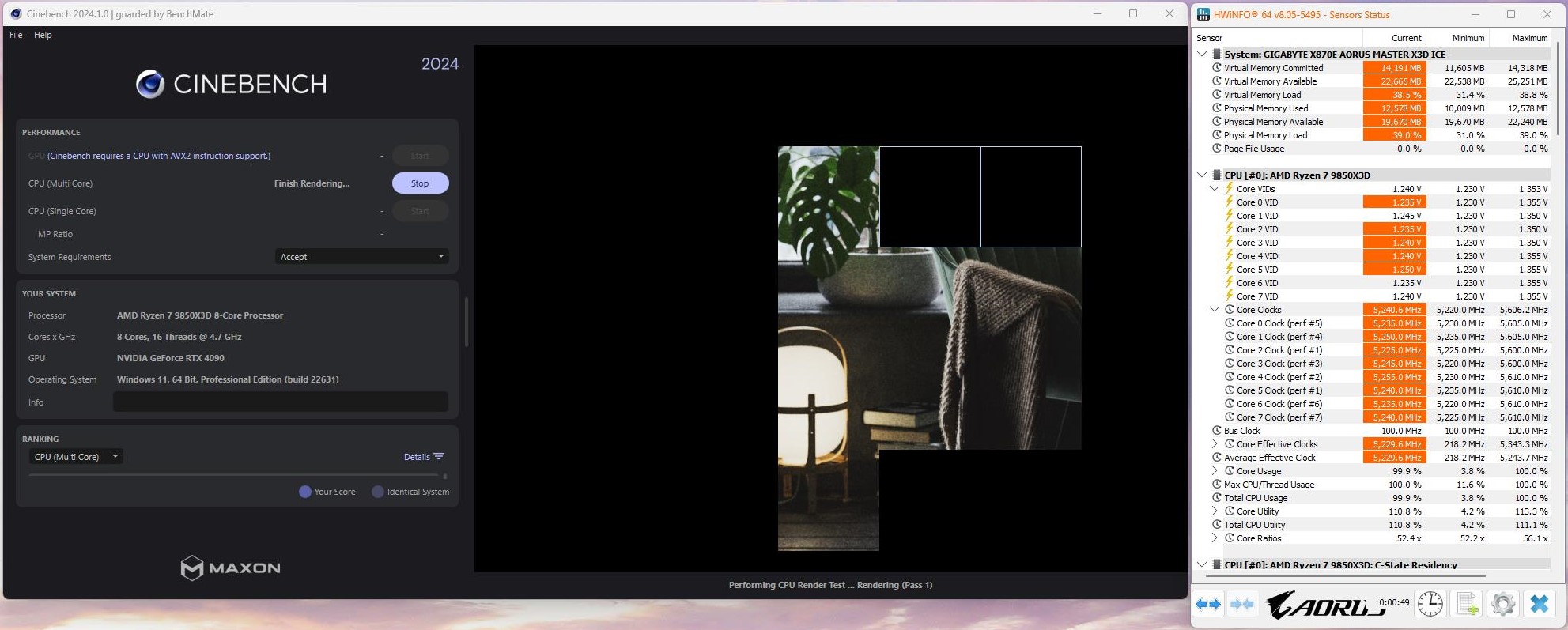 Partea imbucuratoare este ca, in cazul lui 9850X3D, PBO functioneaza asa cum trebuie, iar rezultatele obtinute sunt foarte bune. Testand mai multe praguri de voltaj, am observat din nou ca 1.22–1.23 V reprezinta tensiunea maxima stabila in conditii de racire ambientala, iar peste acest prag am intalnit chiar scalare negativa.
