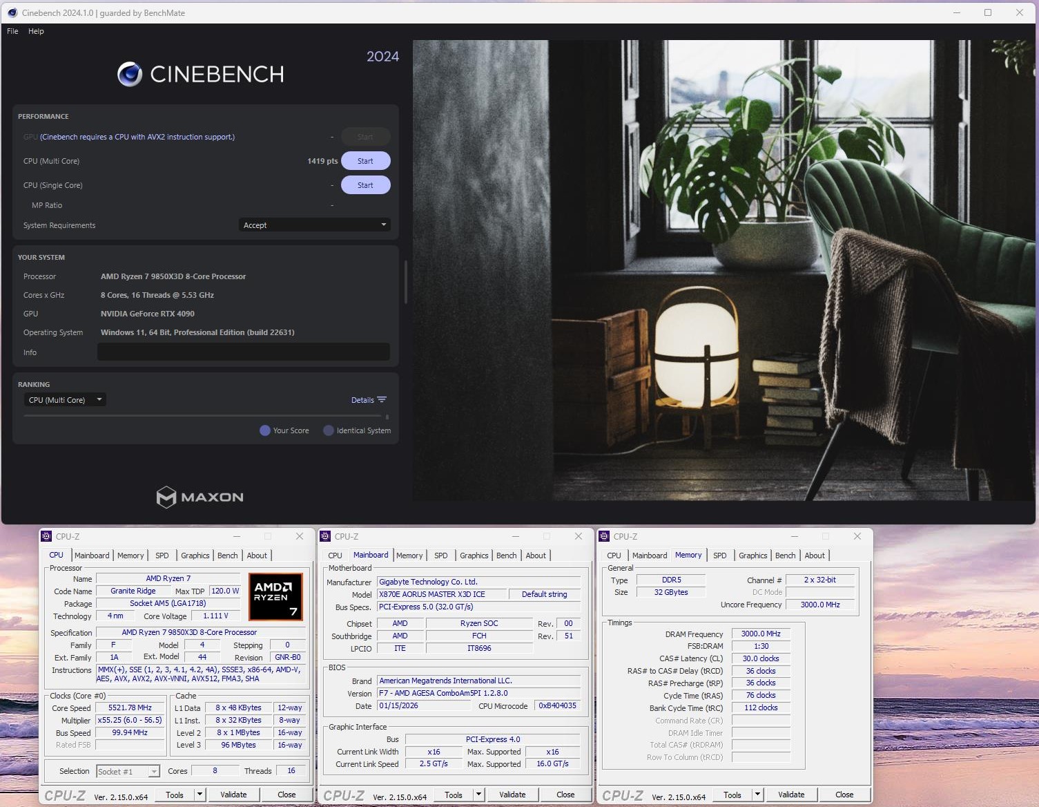 Pentru ca in cazul lui 9800X3D am obtinut cele mai bune rezultate prin overclocking manual, cu stabilitate multithreaded la 5400 MHz si o tensiune de alimentare de 1.21 V, am vrut sa incerc aceeasi metoda si pe noul Ryzen 7 9850X3D, pentru a vedea daca beneficiaza intr-adevar de un binning mai bun. Se pare ca siliciul din Ryzen 7 9850X3D este ales pe spranceana, deoarece in testele noastre a urcat pana la 5525 MHz, fiind stabil in sarcini multithreaded, la o tensiune de alimentare de doar 1.20 V.