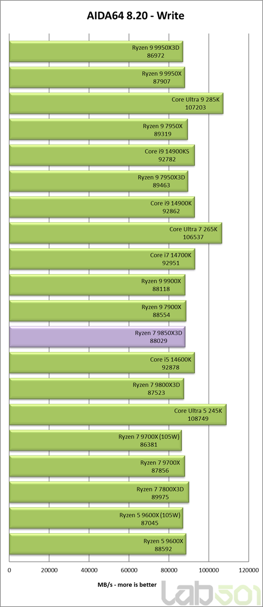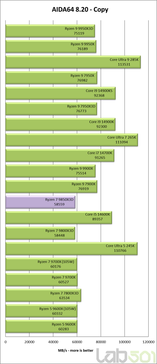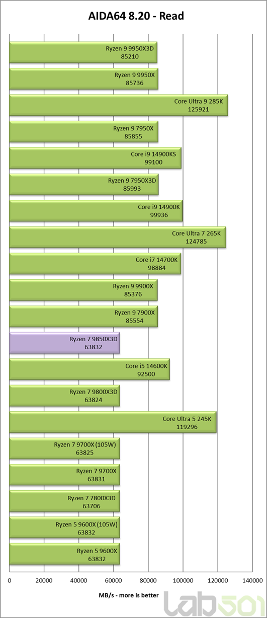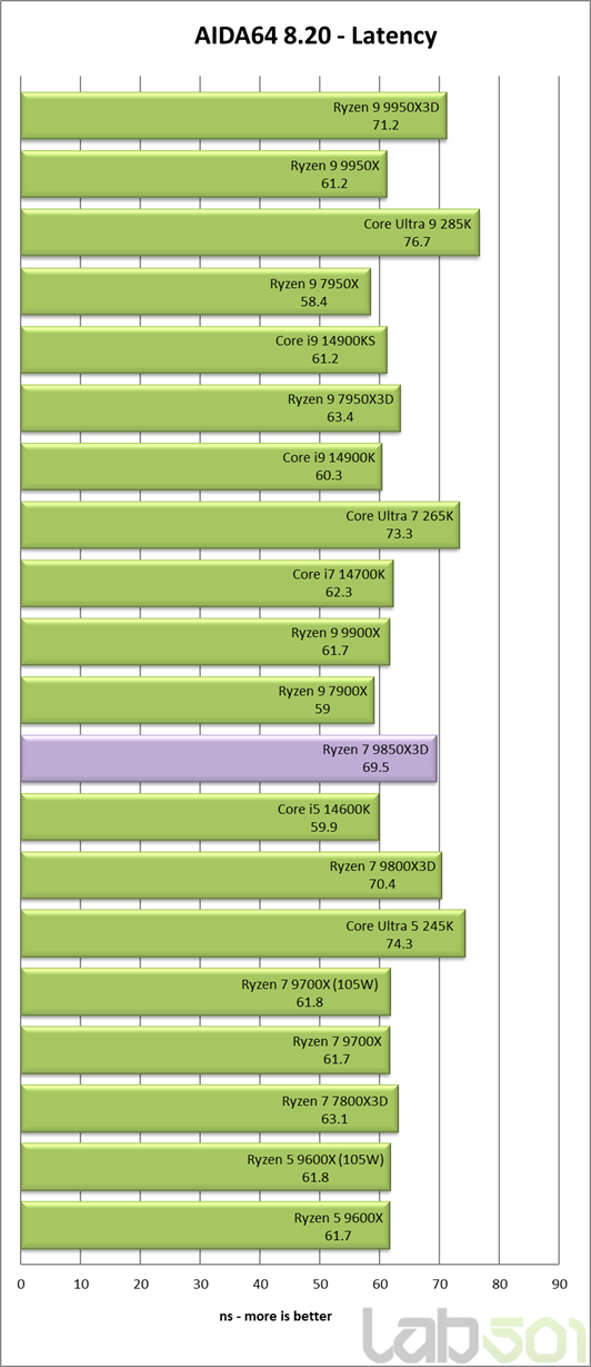 Subsistemul de memorie functioneaza intr-un mod usor diferit in cazul procesoarelor cu un singur CCD fata de cele cu doua CCD-uri, primele avand o latime de banda ceva mai redusa la citire. De asemenea, procesoarele bazate pe arhitectura Zen 5 au o latenta cu aproximativ 2ns mai mare decat a celor Zen 4, iar 3D V-Cache contribuie si el la cresterea latentei la accesarea memoriei. Toate aceste lucruri combinate fac ca Ryzen 7 9850X3D sa inregistreze o latenta de 69.5ns, in timp ce 9700X si 9600X se situeaza sub 62ns.