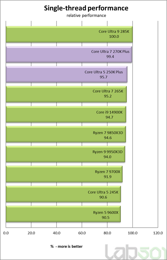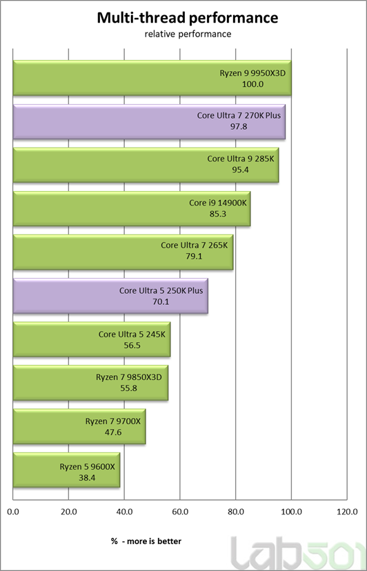 Atat Core Ultra 7 270K Plus, cat si Core Ultra 5 250K Plus impresioneaza prin performanta single-thread foarte ridicata. 270K Plus este practic la egalitate cu varful de gama, diferenta fata de Core Ultra 9 285K fiind sub 1%, ceea ce inseamna ca, in aplicatii dependente de frecventa si IPC, comportamentul este practic identic. De asemenea, Core Ultra 5 250K Plus ofera o performanta single-thread excelenta, apropiata de modelele superioare si peste generatia anterioara, ceea ce il face o alegere foarte buna pentru scenarii unde conteaza latenta si raspunsul rapid al sistemului, precum gaming sau aplicatii uzuale.