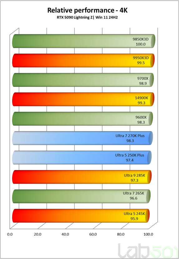Oricum am privi problema, Intel Core i9 14900K ramane in continuare cel mai rapid procesor Intel in gaming disponibil in acest moment pe piata – trist, dar adevarat. La rezolutie 4K, unde limitarea este aproape exclusiv GPU, diferentele devin practic neglijabile: Core Ultra 7 270K Plus obtine ~98.3%, fiind la egalitate cu Ryzen 5 9600X si foarte aproape de restul procesoarelor high-end. Core Ultra 5 250K Plus se situeaza la ~97.4%, cu doar ~2–3% sub varf, ceea ce confirma faptul ca alegerea procesorului are un impact minim in acest scenariu.