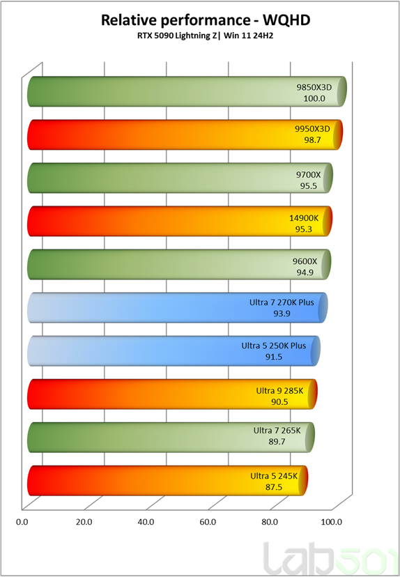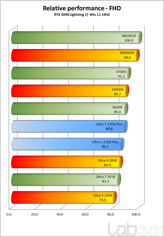 In QHD incepe sa se observe usor influenta procesorului, insa diferentele raman reduse. Core Ultra 7 270K Plus atinge ~93.9%, fiind foarte aproape de 9700X si 14900K, in timp ce Core Ultra 5 250K Plus obtine ~91.5%, mentinand un comportament echilibrat si competitiv in majoritatea titlurilor moderne. La rezolutie FHD, unde limitarea CPU devine evidenta, diferentele se accentueaza: Core Ultra 7 270K Plus obtine ~88.8%, la ~2–3% in spatele lui 9700X si ~1% sub 14900K.