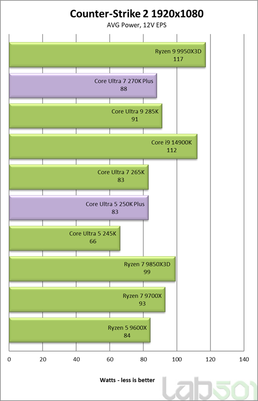 In Counter-Strike 2 la FHD, unde incarcarea CPU este mai ridicata, Core Ultra 7 270K Plus ajunge la ~88W, ramanand mai eficient decat 9950X3D si 14900K, iar Core Ultra 5 250K Plus se situeaza la ~83W, foarte aproape de 265K.