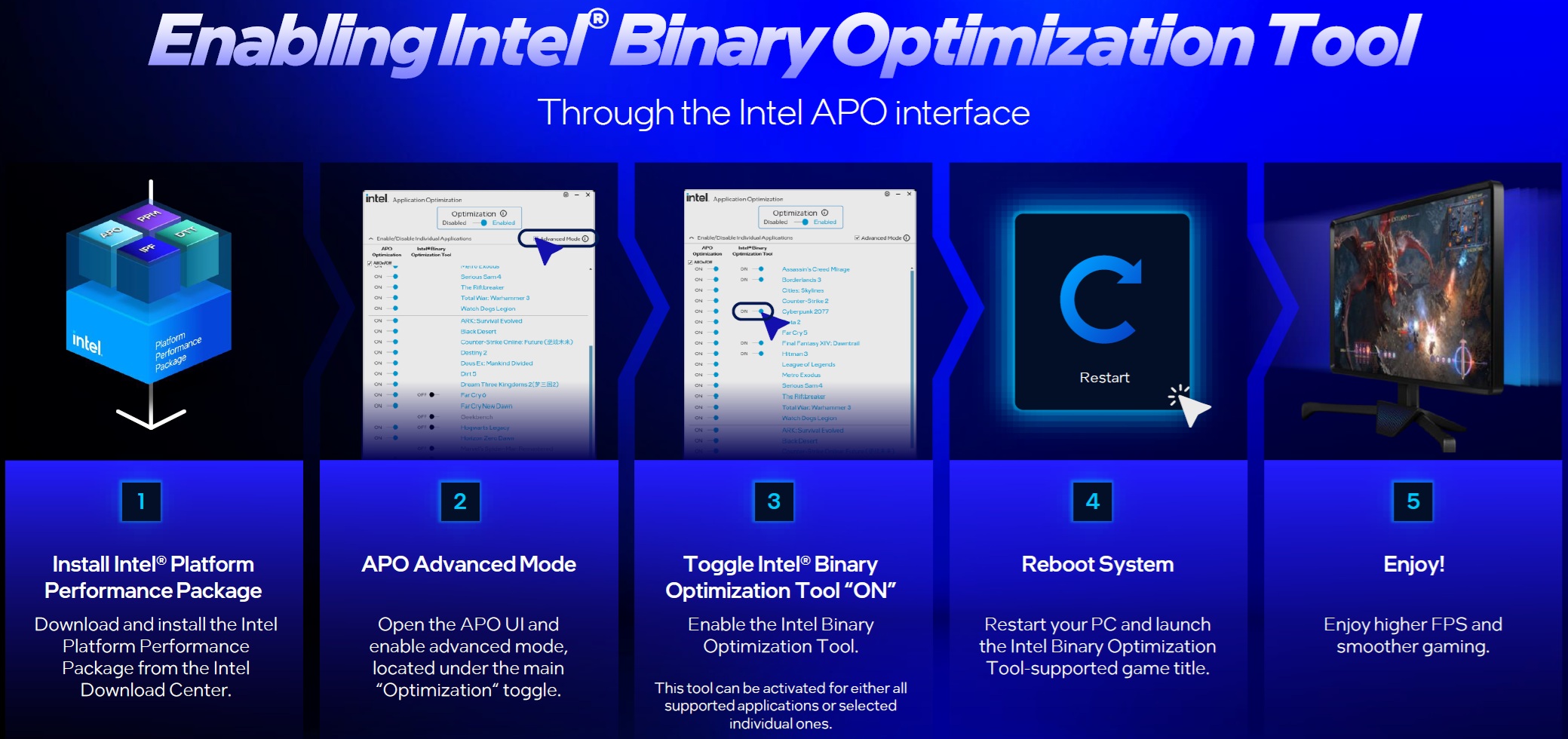 La nivel de runtime, mecanismul functioneaza similar cu inlocuirea shaderelor in cazul GPU-urilor: codul “suboptimal” este interceptat si inlocuit on-the-fly cu o varianta mai eficienta, crescand densitatea de instructiuni executate si reducand latentele interne. Aceste castiguri se adauga peste optimizarile oferite de Intel Application Optimization, precum si peste performanta nativa a hardware-ului. De asemenea, impactul nu se limiteaza la FPS mediu, ci se reflecta si in framerate-ul minim, ceea ce inseamna o experienta mai fluida si mai consistenta in scenarii reale de utilizare. Ca si in cazul APO, profilurile sunt livrate prin Intel Platform Performance Package si pot fi actualizate in timp, ceea ce inseamna ca performanta poate creste ulterior lansarii, fara modificari hardware.
