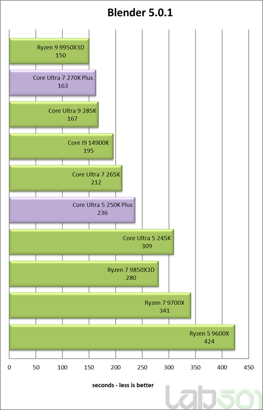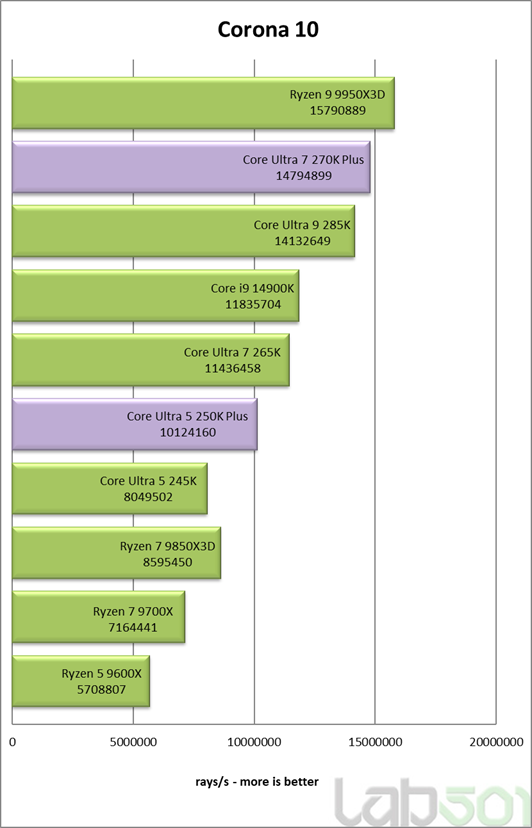 In testele de randare, Intel Core Ultra 7 270K Plus se pozitioneaza foarte competitiv, depasind Intel Core Ultra 9 285K cu ~3–5% si Intel Core i9 14900K cu pana la ~25% in Corona si V-Ray, fiind in acelasi timp la ~8–9% in urma lui AMD Ryzen 9 9950X3D in Blender, in timp ce Core Ultra 5 250K Plus ofera un salt consistent fata de 245K (pana la ~25–26%) depasind chiar si Ryzen 7 9850X3D cu ~13–18% in V-Ray si Corona, confirmand un avantaj clar in segmentul sau.