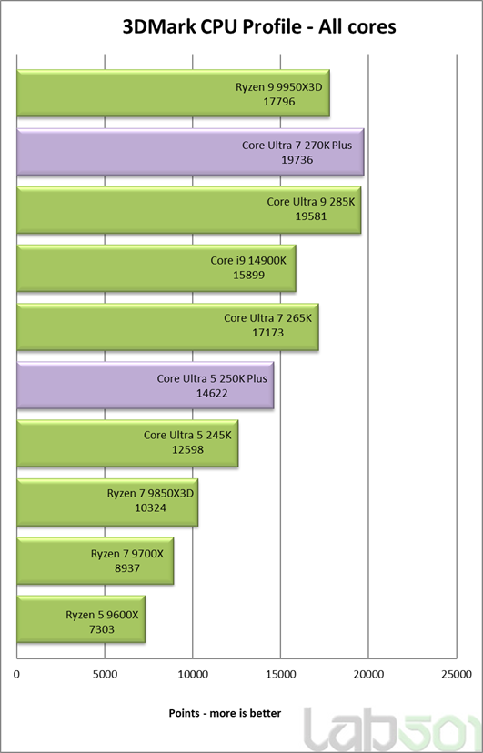 In scenariul Max Threads, Intel Core Ultra 7 270K Plus obtine cel mai ridicat scor, depasind atat Core Ultra 9 285K, cat si Ryzen 9 9950X3D, ceea ce evidentiaza o scalare foarte buna pe toate nucleele. Intel Core Ultra 5 250K Plus ofera, la randul sau, o performanta solida pentru segmentul sau, insa diferenta fata de modelele superioare – printre care si 265K, care vine cu doua nuclee in plus – devine vizibila in workload-uri complet paralelizate precum acesta.