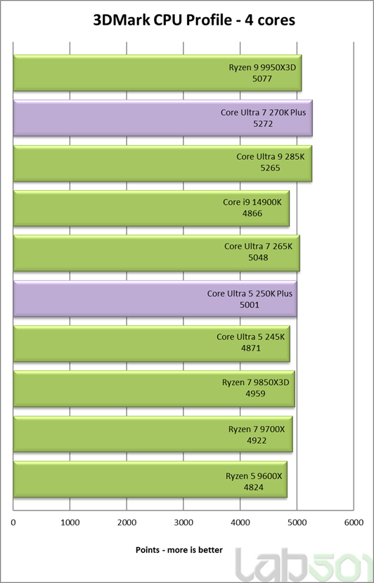 In testul pe 8 fire de executie – care simuleaza, de exemplu, scenarii de gaming DX12 moderne – diferentele se reduc considerabil, 270K Plus si 285K fiind practic la egalitate, in timp ce 270K Plus se mentine usor in fata lui 9950X3D. Intel Core Ultra 5 250K Plus ramane competitiv, oferind un nivel de performanta echilibrat. In scenariul care foloseste 4 thread-uri, ierarhia se compacteaza si mai mult, Core Ultra 7 270K Plus mentinandu-se pe prima pozitie, cu diferente minime fata de 285K. Core Ultra 5 250K Plus ofera in continuare o performanta apropiata de modelele superioare, confirmand comportamentul foarte bun in sarcini cu paralelizare redusa, cum ar fi jocurile mai vechi sau activitatile de zi cu zi.