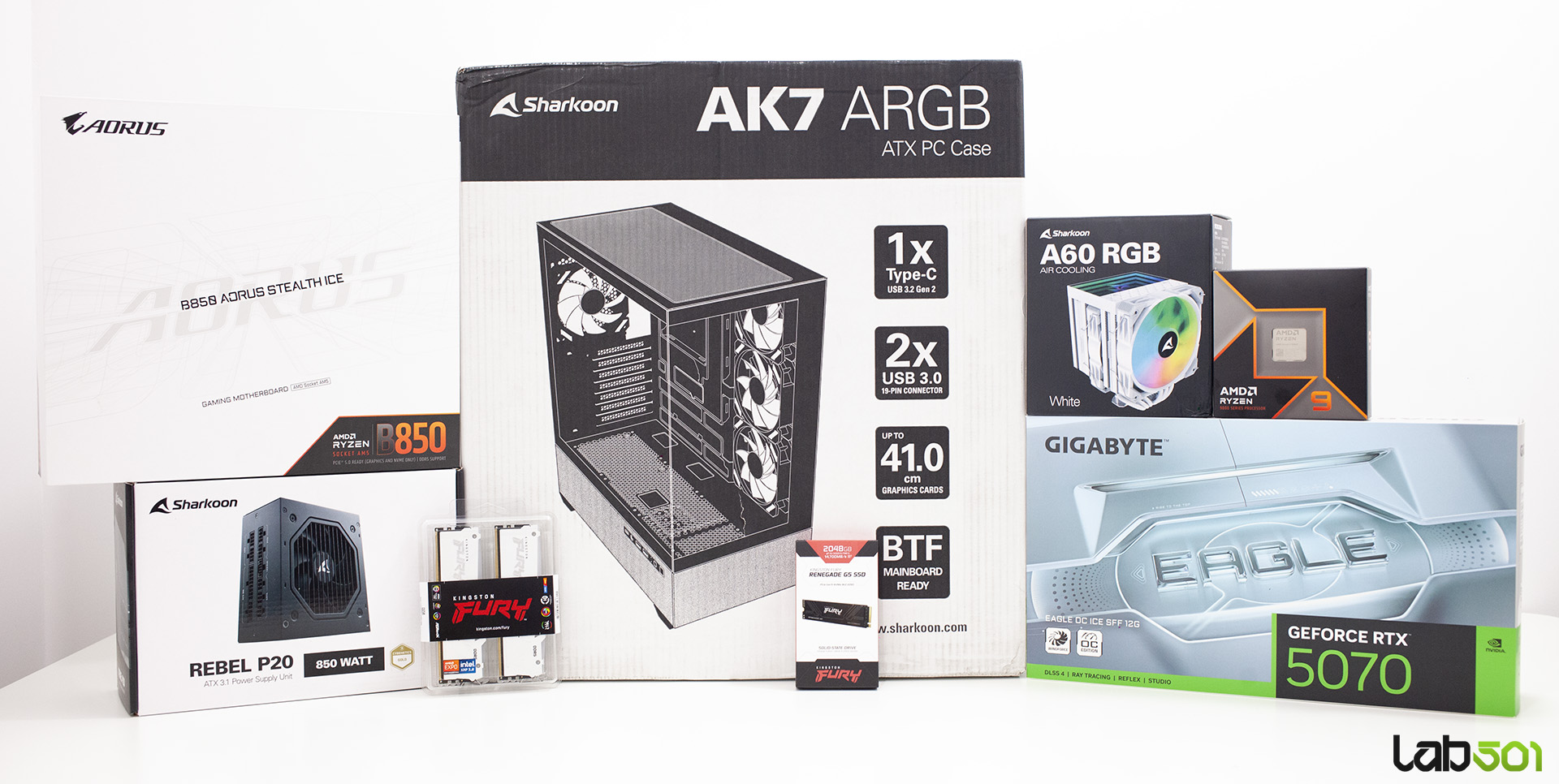 Pentru partea grafica am ales GIGABYTE GeForce RTX 5070 Eagle OC ICE SFF 12G, in timp ce memoria DDR5 si stocarea NVMe sunt furnizate de Kingston, prin kitul Kingston FURY Beast White RGB 32GB DDR5-6000 CL30 si SSD-ul FURY Renegade G5 2TB, bazat pe interfata PCIe Gen5. Carcasa, sursa si sistemul de racire vin de la Sharkoon, cu produse selectate special pentru un build all-white acolo unde conteaza: AK7 ARGB White, Rebel P20 850W si A60 RGB White.