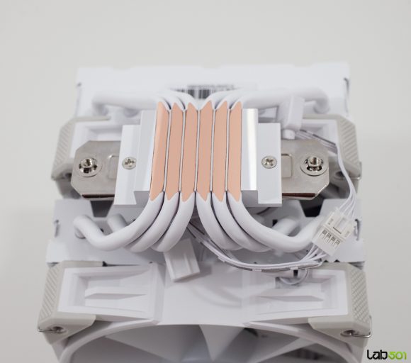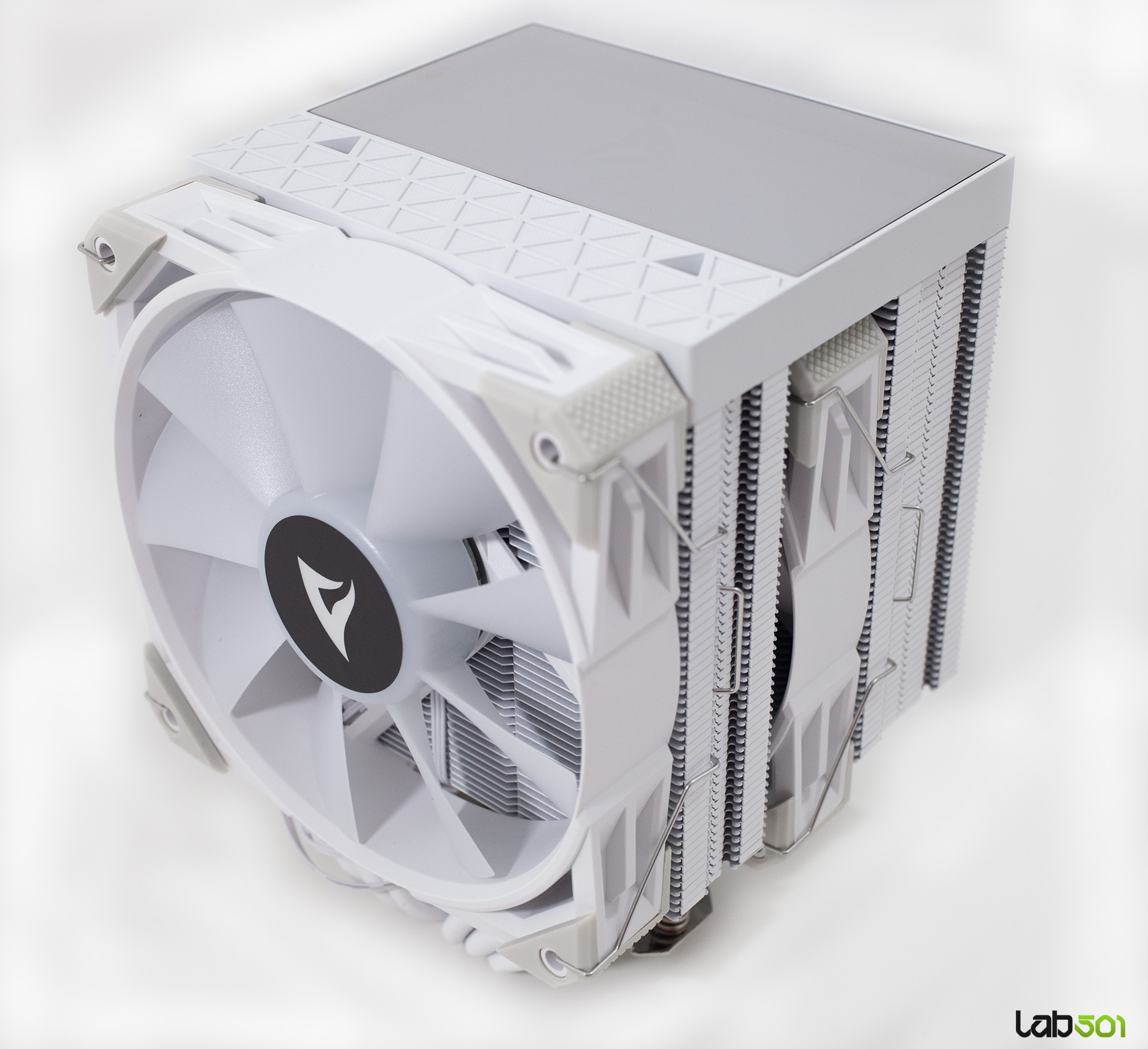 Mentinerea sub control a temperaturilor pentru un procesor precum Ryzen 9 9900X (TDP de 120 W) este esentiala, iar Sharkoon A60 RGB White se ridica fara probleme la acest nivel. Avem de-a face cu un cooler dual-tower pe aer, echipat cu doua radiatoare din aluminiu traversate de 6 heatpipe-uri din cupru de 6 mm, baza folosind o arhitectura de tip HDT (Heatpipe Direct Touch). Cooler-ul este livrat cu doua ventilatoare ARGB de 120 mm PWM preinstalate, dispuse intr-o configuratie push-pull, unul dintre acestea fiind amplasat central intre cele doua blocuri de lamele. Un element distinctiv il reprezinta capacul superior al radiatorului, care integreaza un efect de infinity mirror ARGB, oferind un aspect vizual spectaculos, fara a incarca excesiv designul.