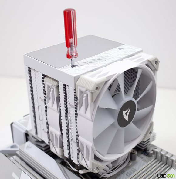 In ciuda constructiei dual-tower, inaltimea cooler-ului este de doar 159 mm, permitand integrarea fara probleme atat in carcase entry-level, cat si in carcasa utilizata de noi, care accepta coolere de pana la 170 mm. Procesul de instalare este facilitat de kit-ul complet inclus in pachet, Sharkoon livrand toate accesoriile necesare: backplate-uri, suruburi, pasta termica si chiar o surubelnita lunga, utila pentru montajul radiatorului fara a demonta ventilatoarele deja instalate.