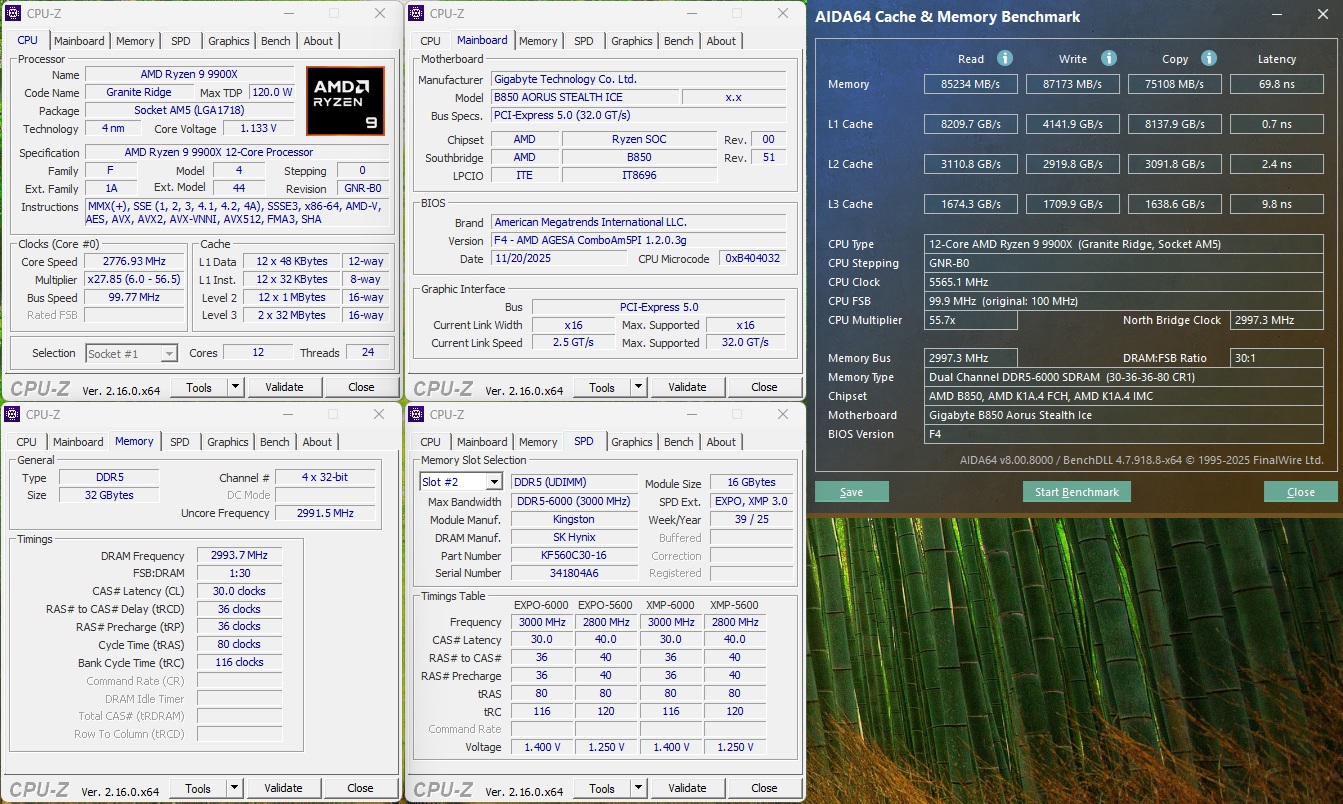 In aceste conditii, sistemul a inregistrat un scor de 1969 puncte in testul Multi Core, un rezultat cu 4,3% mai ridicat fata de cel obtinut in review-ul dedicat procesorului. Pentru evaluarea subsistemului de memorie am rulat AIDA64 Cache & Memory, unde platforma a obtinut o latenta sub 70 ns si viteze de transfer in jur de 85 GB/s, valori excelente pentru un sistem din 2026.
