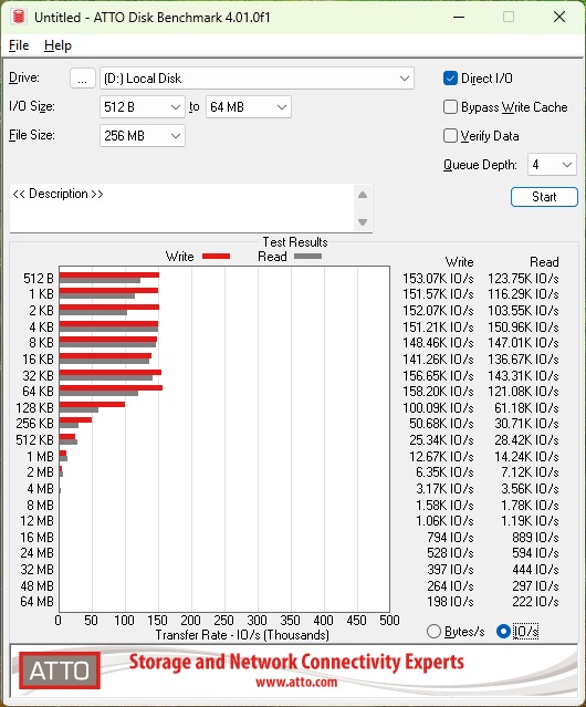 Rezultatele obtinute in ATTO Disk Benchmark confirma performanta ridicata, cu viteze de pana la 13,9 GB/s la citire si 12,4 GB/s la scriere, demonstrand ca Renegade G5 exploateaza eficient latimea de banda oferita de interfata PCIe Gen5.