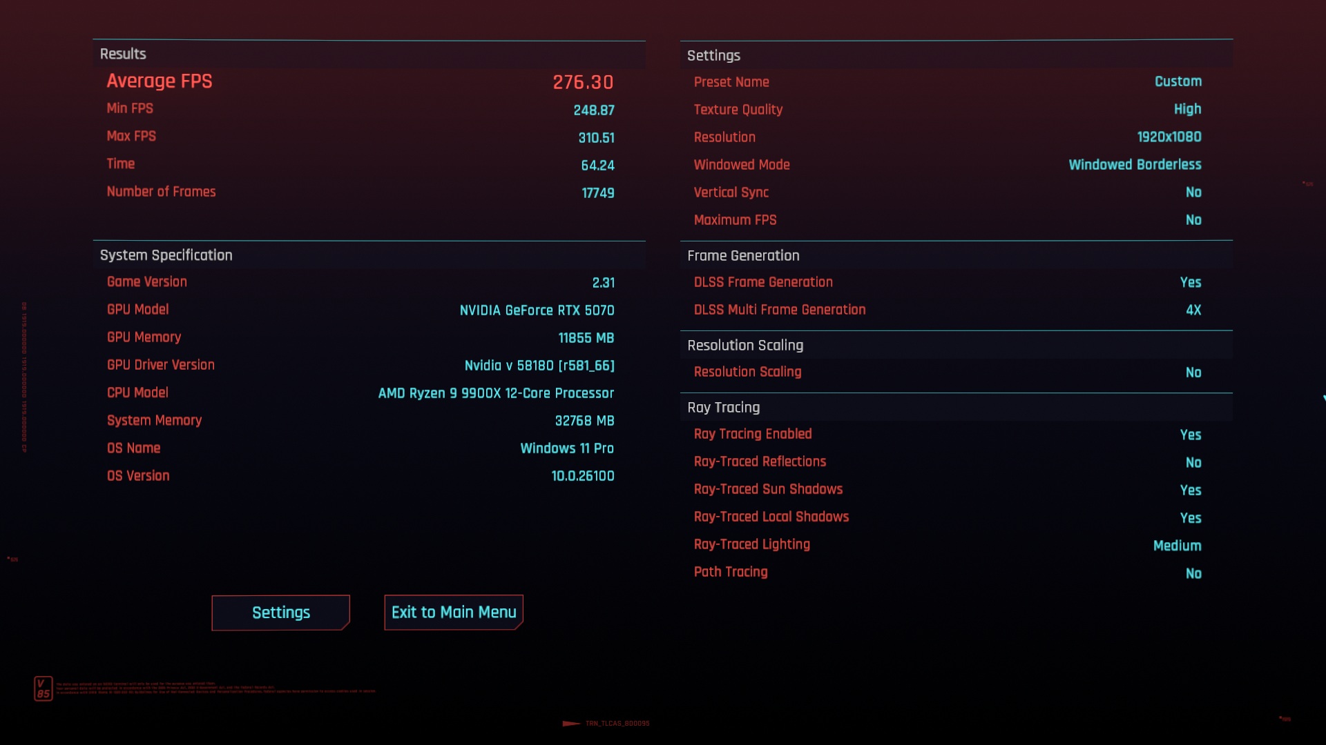 Cel de-al doilea joc testat a fost Cyberpunk 2077, mult mai solicitant. In aceleasi conditii de test, la rezolutie 1080p, sistemul a obtinut un framerate mediu de 91 FPS si un minim de 81 FPS, valori foarte apropiate de cele obtinute pe platforma de test cu 9800X3D (92 FPS mediu / 80 FPS minim). Activand insa algoritmul de frame generation DLSS, suportat de placile NVIDIA Geforce RTX din seria 5000, rezultatele au crescut semnificativ: 276 FPS mediu si 249 FPS minim, transformand experienta de joc intr-una mult mai fluida.