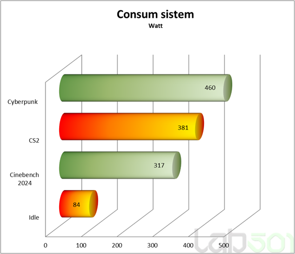 Consumul sistemului este mai mult decat decent pentru nivelul de performanta oferit. Practic, o sursa de 650 W sau 750 W ar fi fost suficienta din punct de vedere strict al puterii disponibile (insa majoritatea nu ofera conector 12V-2×6 nativ), avand in vedere ca cel mai ridicat consum masurat a fost in Cyberpunk 2077, unde intregul sistem a atins aproximativ 460 W.