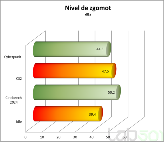 Avand in vedere ca Ryzen 9 9900X genereaza un consum ridicat cu PBO activ, cooler-ul Sharkoon A60 reuseste sa tina temperatura sub control, insa cu pretul unui nivel de zgomot ceva mai ridicat in sarcini intense. Astfel, am masurat 39.4 dBA in idle, 44–47 dBA in gaming si un maxim de 50.2 dBA in aplicatii multithreaded, precum Cinebench 2024.