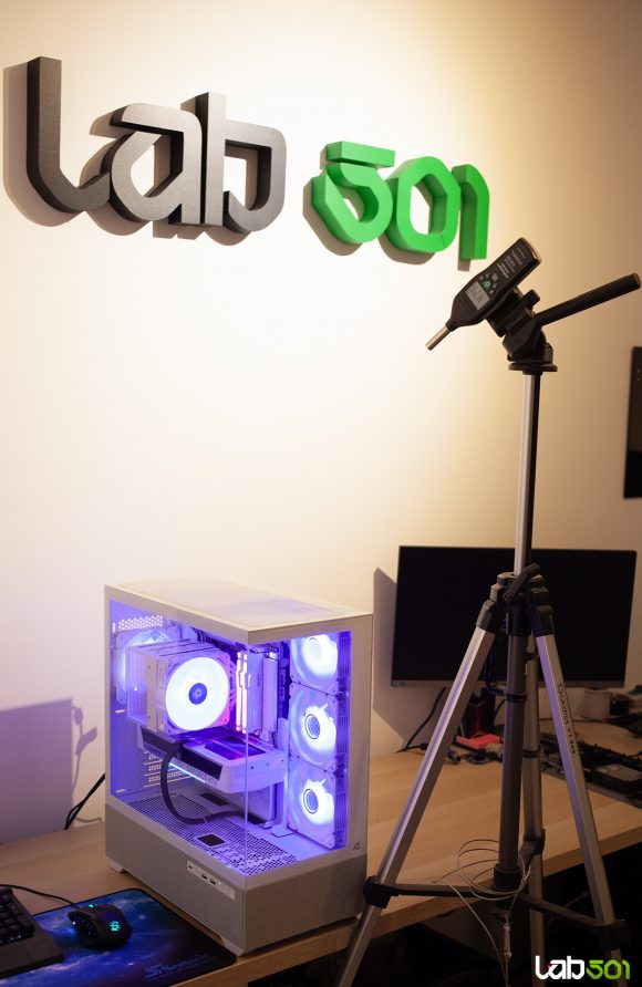 Zgomotul generat de sistem a fost masurat conform metodologiei utilizate in testele de coolere pe aer si AIO-uri, cu aceeasi pozitionare si distanta fata de sistem, asa cum sunt prezentate in imaginea de mai jos. In utilizarea normala, sistemul se mentine relativ silentios, nivelul de zgomot fiind direct proportional cu gradul de incarcare al procesorului.