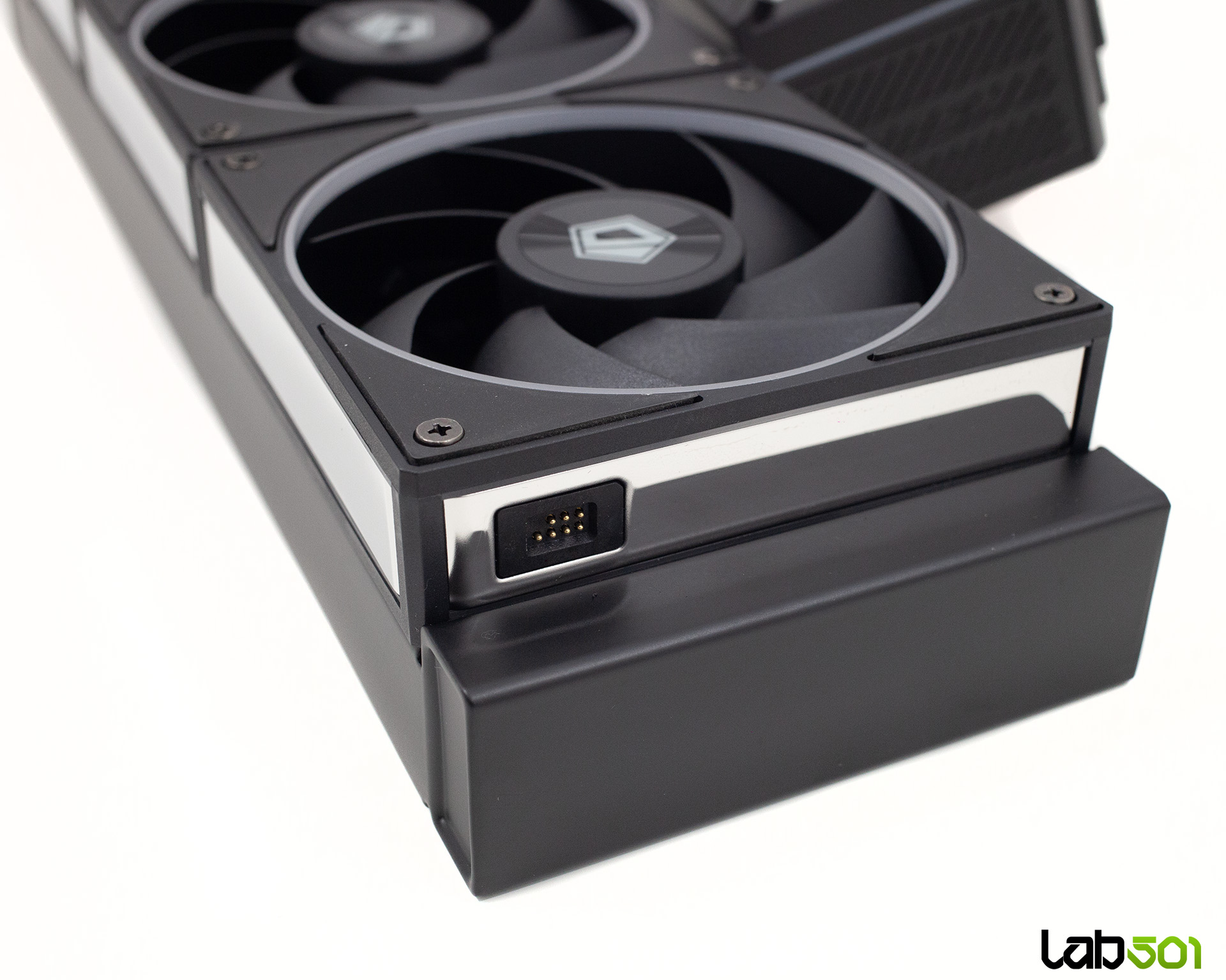 Ventilatoarele incluse sunt modele ID-Cooling MF-1230 ARGB de 120 mm, cu sapte pale si o grosime marita la 30 mm (fata de 25 mm, cat au ventilatoarele standard). Aceasta diferenta aparent mica are un impact semnificativ asupra fluxului de aer si presiunii statice, ventilatoarele fiind capabile sa atinga pana la 2300 RPM in gol (in testele noastre, aproximativ 2200 RPM montate pe radiator). Debitul de aer depaseste 80 CFM, iar presiunea statica ridicata le face potrivite pentru radiatoare dense si groase, precum cel utilizat aici.