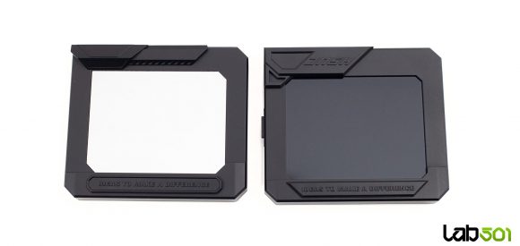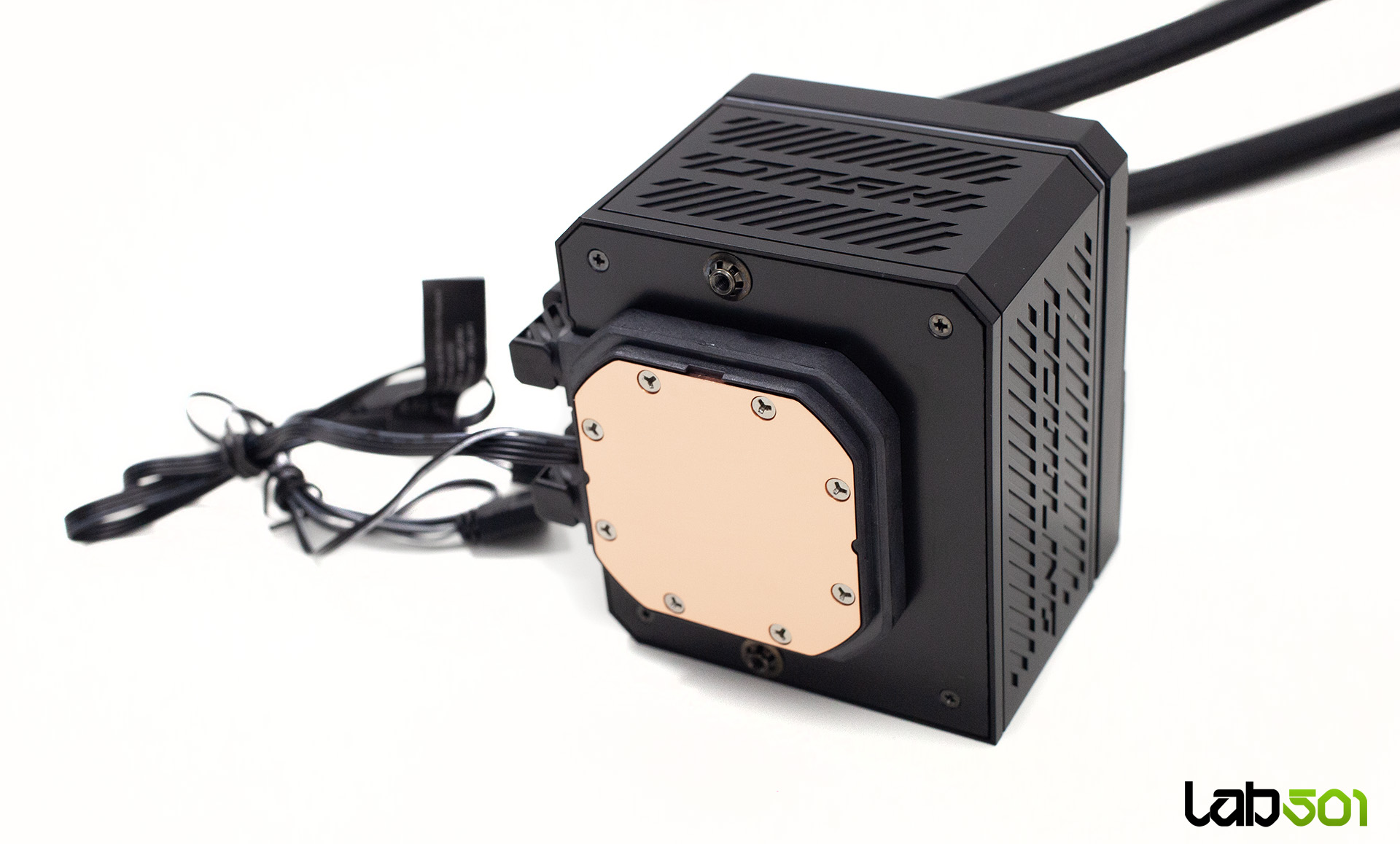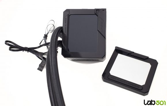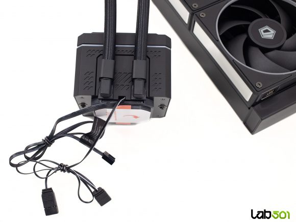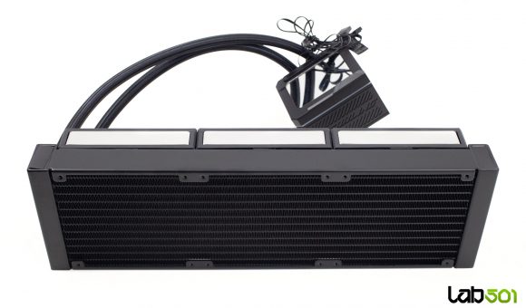 Radiatorul este realizat din aluminiu, cu aripioare fine si densitate mare, ceea ce contribuie la un transfer termic eficient. Pe laterale sunt prezente ranforsari metalice care previn deformarea, iar finisajul negru mat confera ansamblului un aspect sobru si uniform. Furtunele sunt confectionate din cauciuc EPDM acoperit cu o tesatura densa, oferind rezistenta mecanica ridicata si o flexibilitate excelenta. Cu o lungime de aproximativ 46 cm, acestea permit montarea radiatorului atat in plafon, cat si in partea frontala a carcasei, in functie de preferinte si spatiul disponibil.
