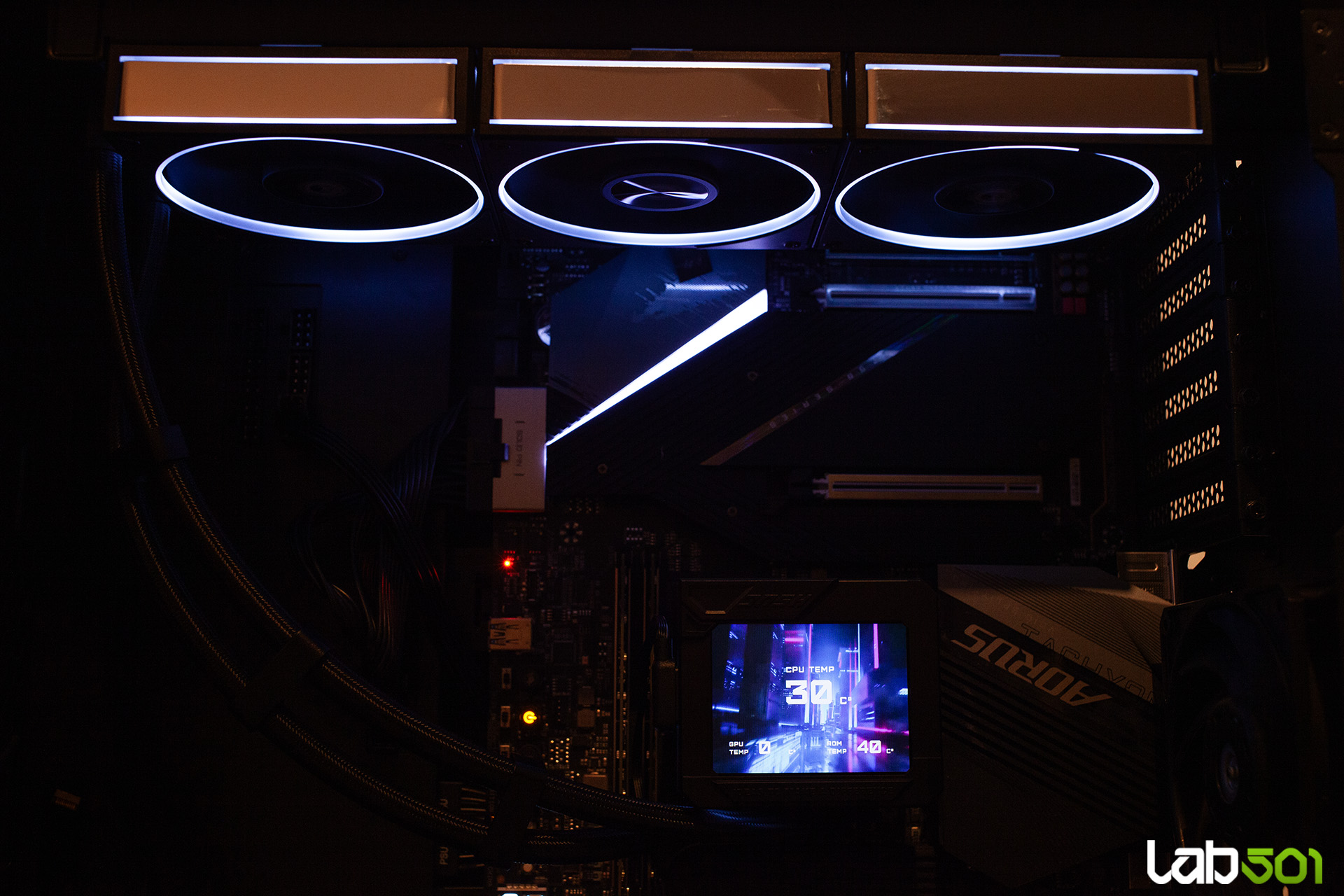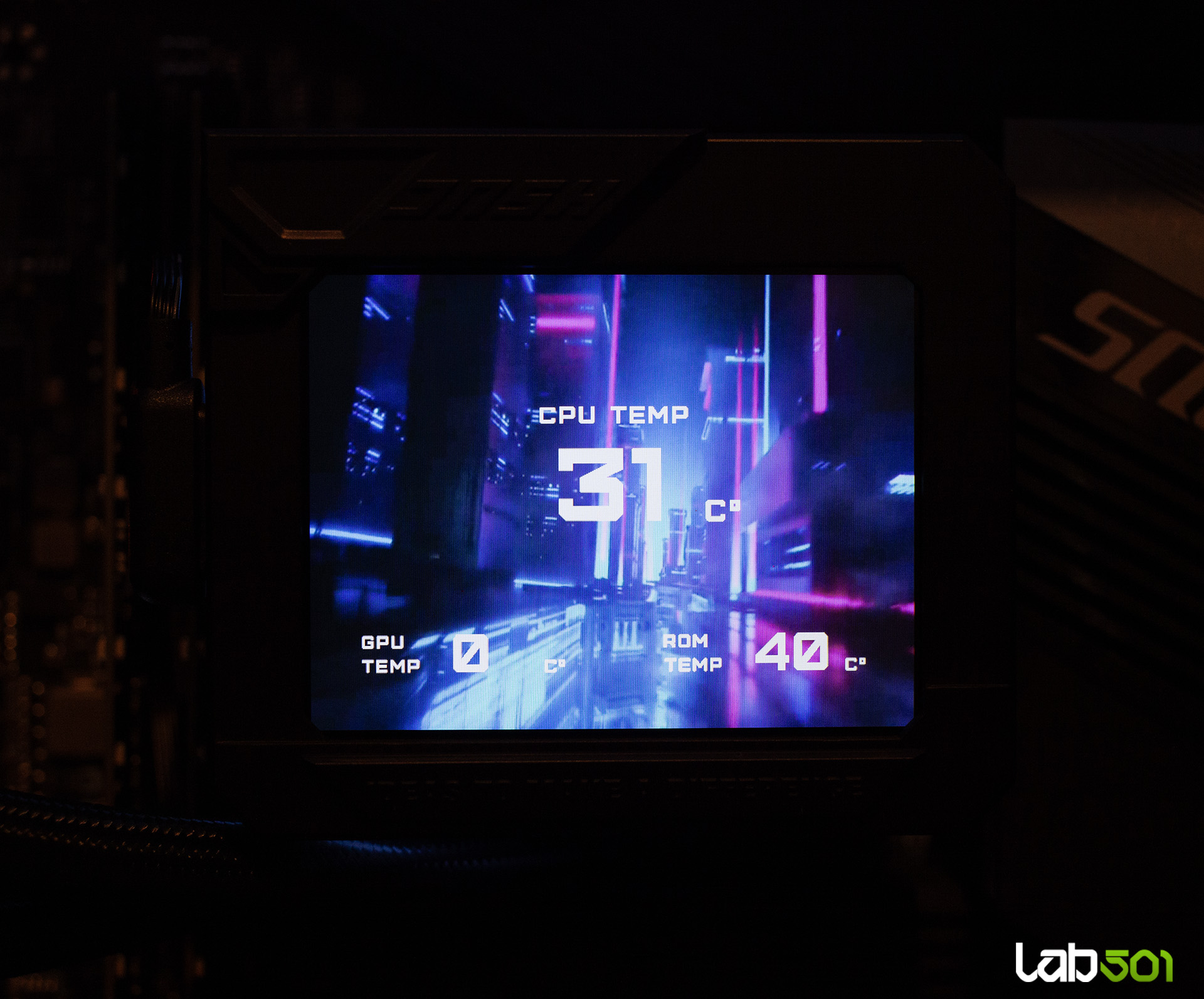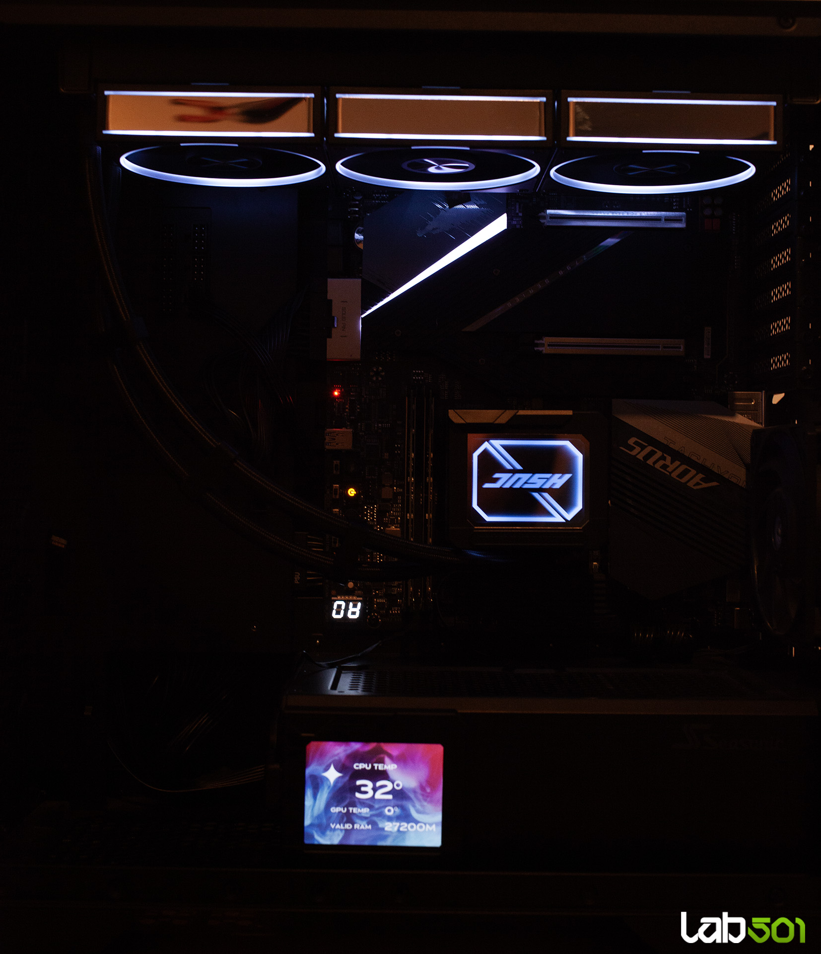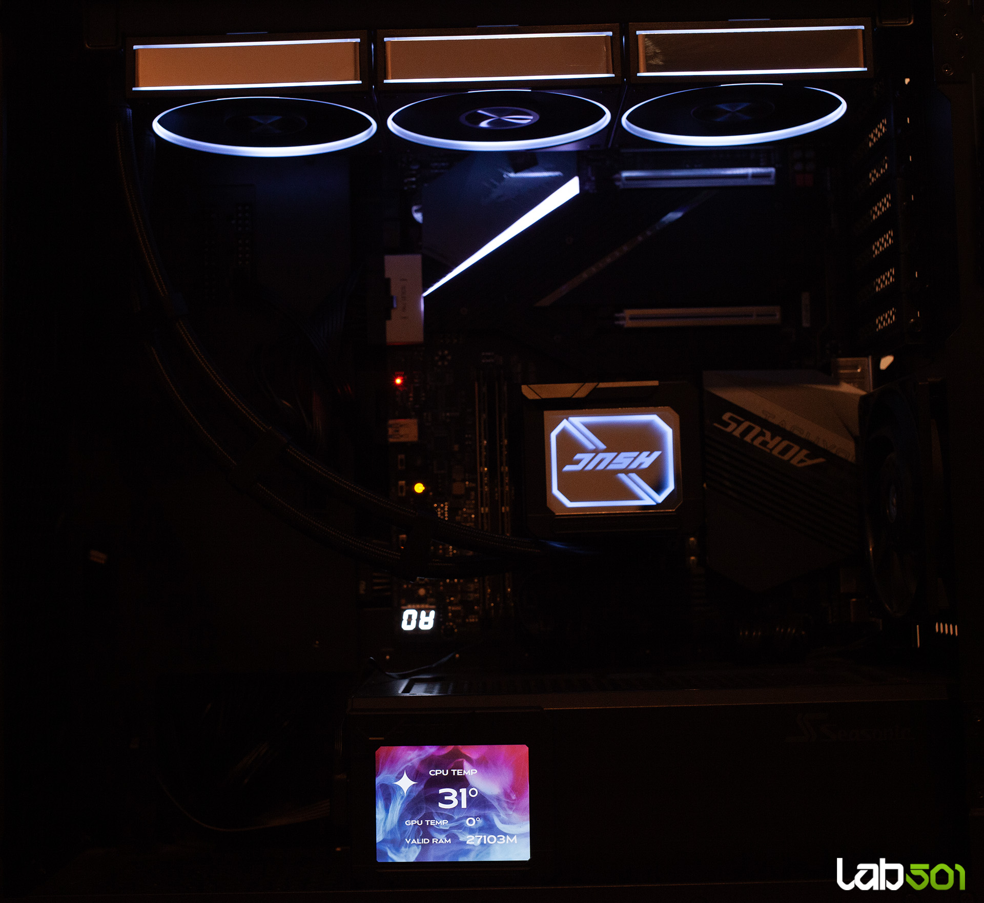Pompa foloseste o arhitectura interna de generatie a saptea, echipata cu rulment ceramic, menita sa reduca vibratiile si zgomotul in functionare. Viteza maxima ajunge la 2900 RPM, iar conectorii pentru furtune pot pivota la iesirea din pompa, facilitand montajul chiar si in carcase mai compacte. Capacul pompei este atasat magnetic, cel instalat din fabrica avand un finisaj tip oglinda si iluminare ARGB activa in timpul functionarii. Acesta poate fi inlocuit cu ecranul LCD de 3.5″ inclus in pachet, insa scenariul mai interesant este montarea display-ului intr-o pozitie separata, mai vizibila, de exemplu in exteriorul carcasei sau chiar pe panoul frontal. In imaginile de mai jos, cu sistemul complet asamblat si iluminat, am explorat ambele variante de instalare pentru a evidentia flexibilitatea acestui design.