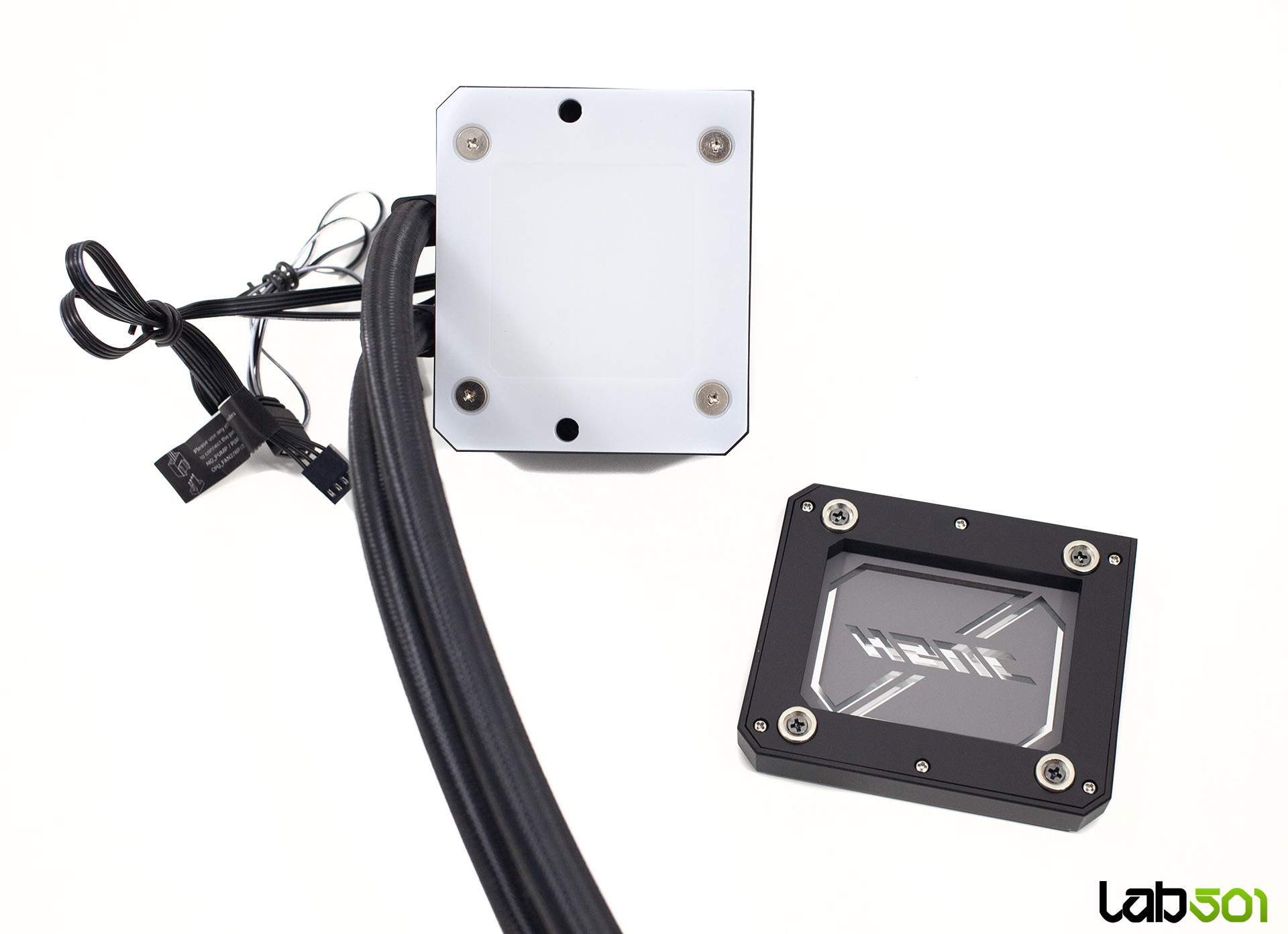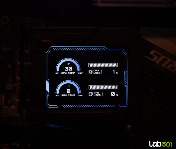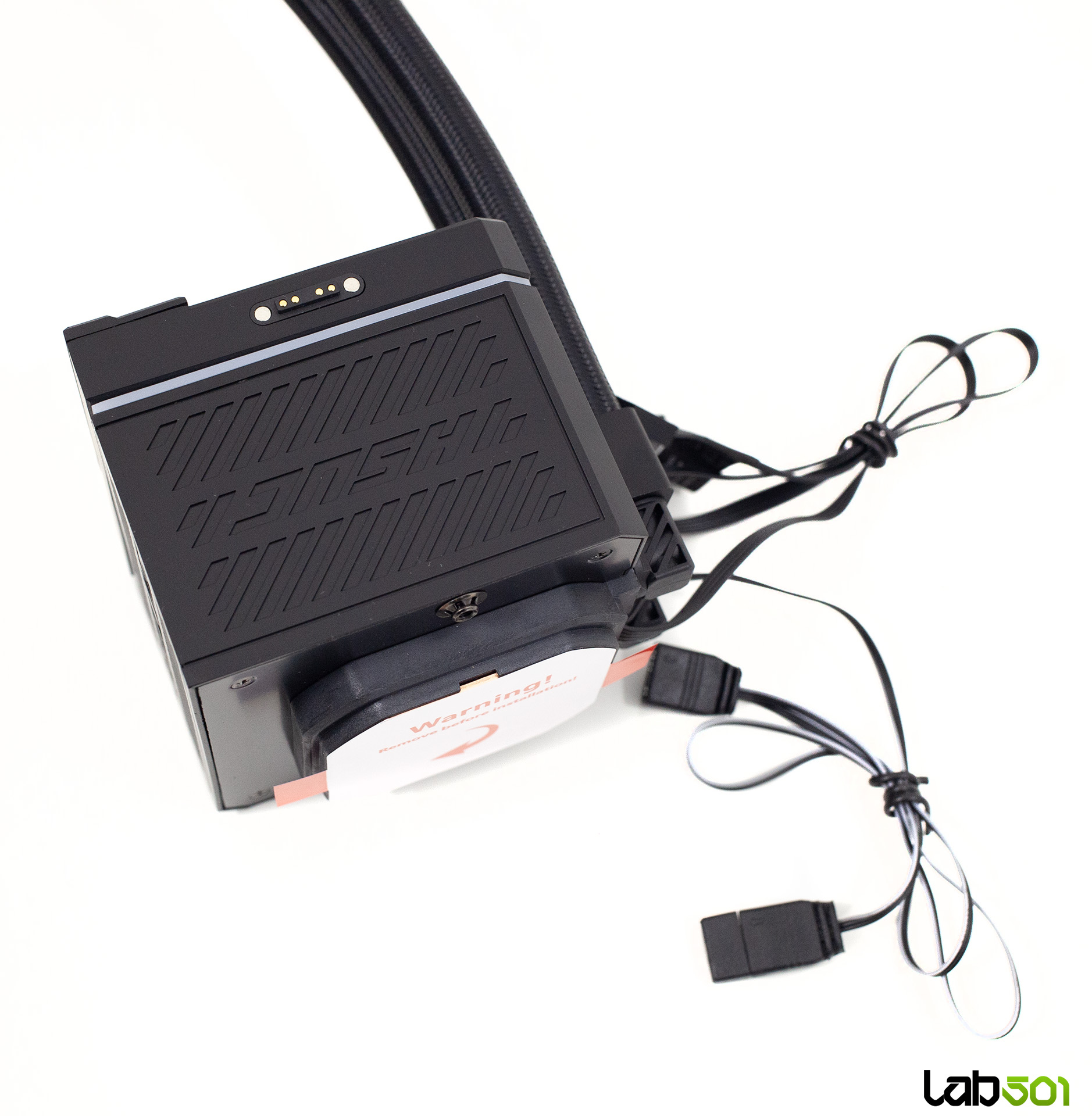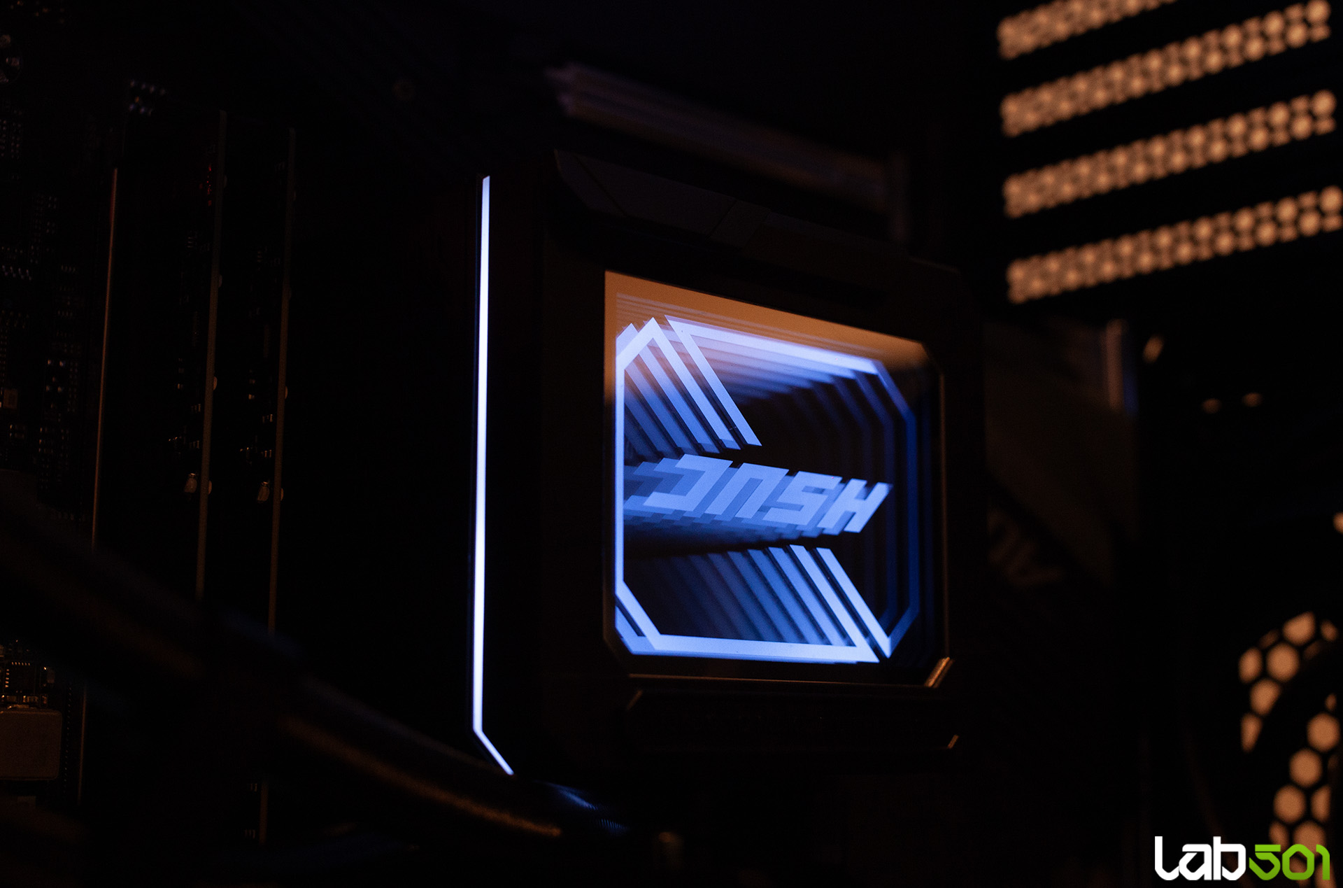 Pompa foloseste o arhitectura interna de generatie a saptea, echipata cu rulment ceramic, menita sa reduca vibratiile si zgomotul in functionare. Viteza maxima ajunge la 2900 RPM, iar conectorii pentru furtune pot pivota la iesirea din pompa, facilitand montajul chiar si in carcase mai compacte. Capacul pompei este atasat magnetic, cel instalat din fabrica avand un finisaj tip oglinda si iluminare ARGB activa in timpul functionarii. Acesta poate fi inlocuit cu ecranul LCD de 3.5″ inclus in pachet, insa scenariul mai interesant este montarea display-ului intr-o pozitie separata, mai vizibila, de exemplu in exteriorul carcasei sau chiar pe panoul frontal. In imaginile de mai jos, cu sistemul complet asamblat si iluminat, am explorat ambele variante de instalare pentru a evidentia flexibilitatea acestui design.