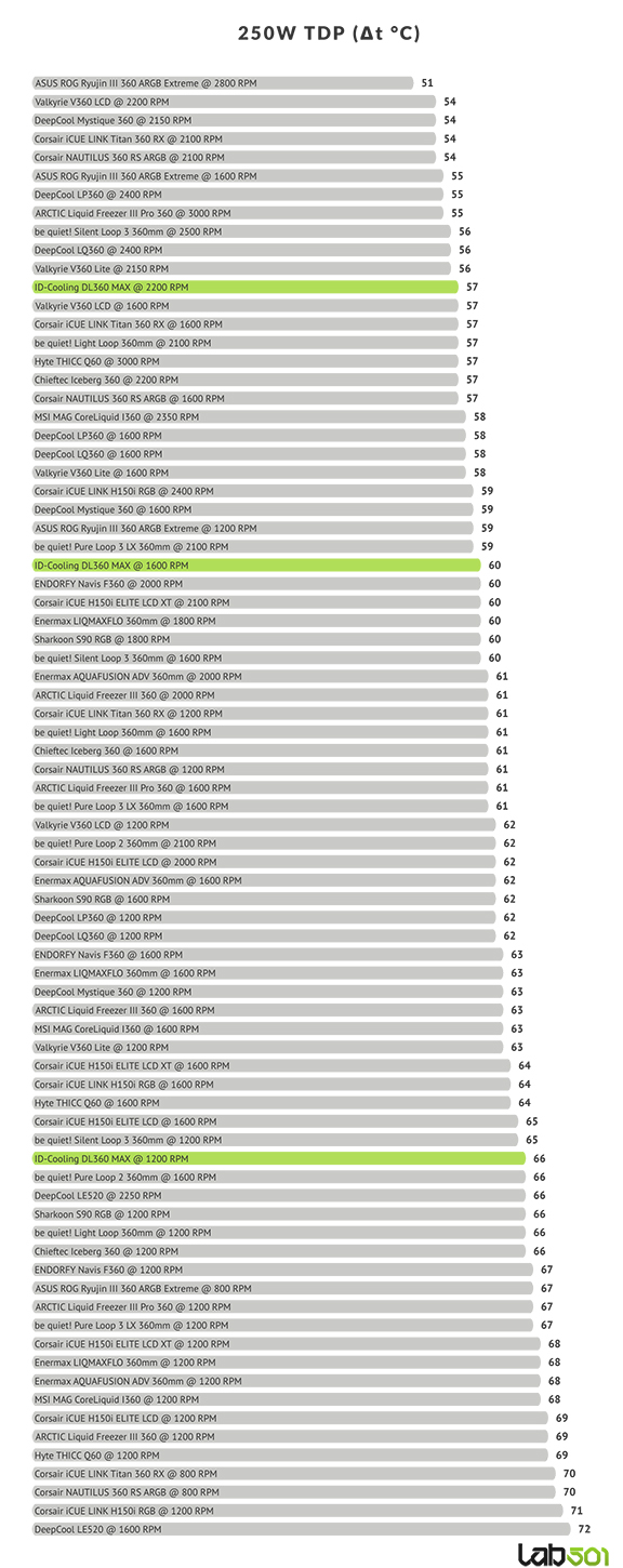 ID-Cooling DL360 MAX reuseste sa faca o figura foarte buna in testele noastre, obtinand rezultate la turatia maxima comparabile cu solutii consacrate precum ARCTIC Liquid Freezer III, DeepCool LQ360 sau be quiet! Light Loop. Coborand turatia la 1600 RPM, AIO-ul mentine un nivel de performanta similar cu be quiet! Silent Loop 3 la aceeasi viteza, dar si cu alte AIO-uri din generatii anterioare ruland la turatia maxima, precum ENDORFY Navis F360 sau Corsair iCUE H150i Elite LCD XT.