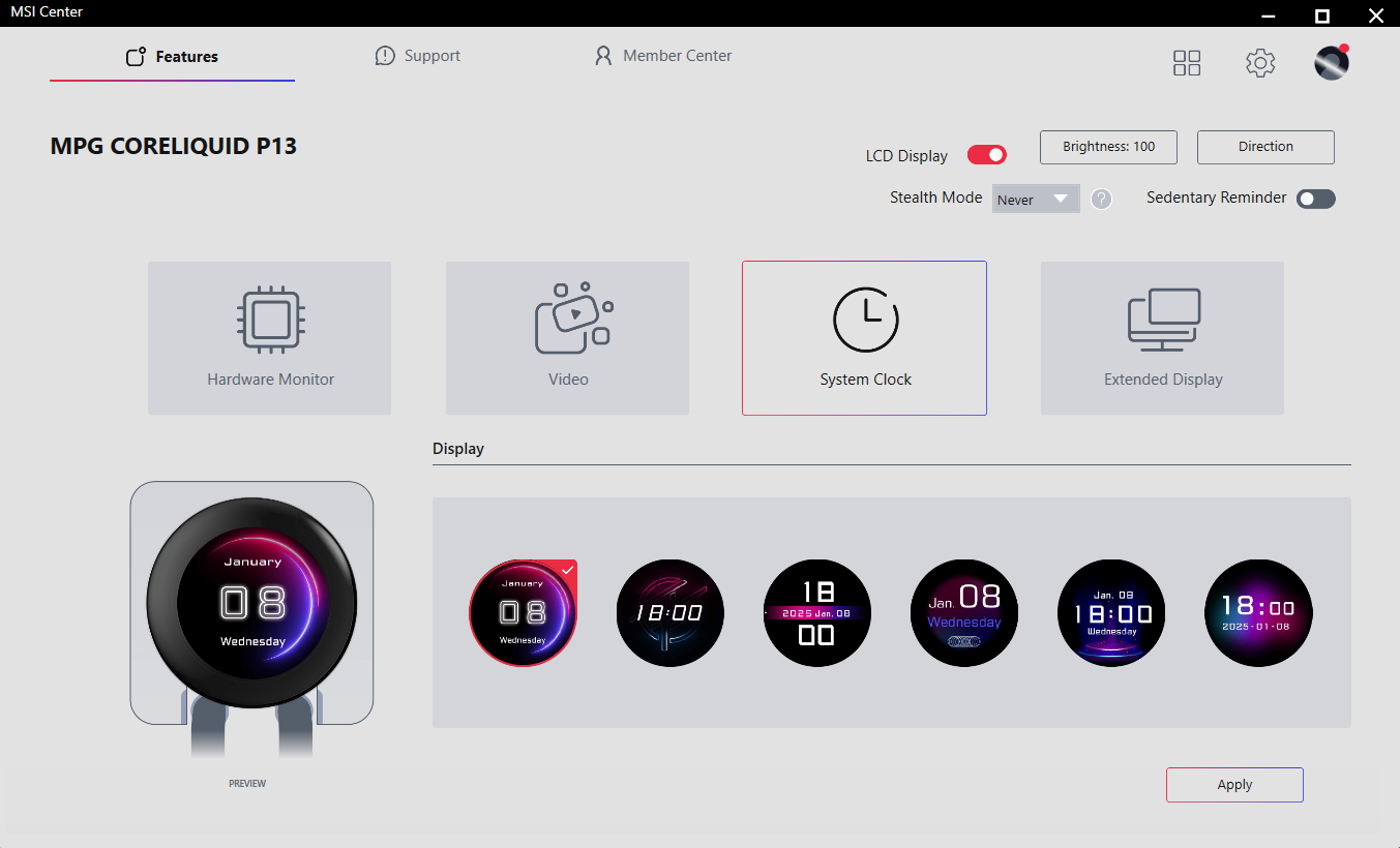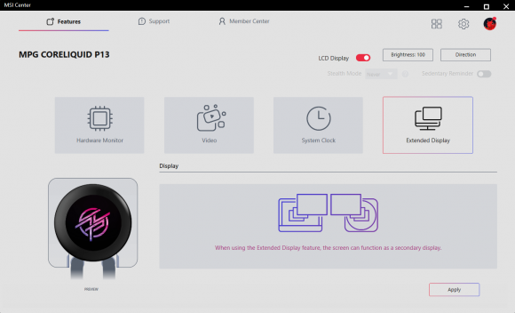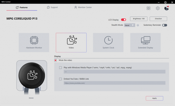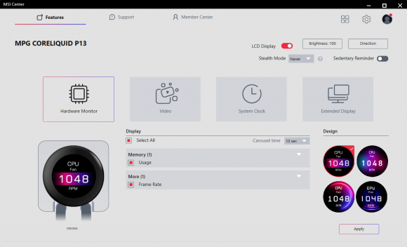 MSI Center include un modul dedicat pentru seria CoreLiquid cu LCD, oferind patru moduri principale de afisare pentru ecranul coolerului: Hardware Monitor, Video, System Clock si Extended Display. In modul Hardware Monitor poti selecta diversi parametri ai sistemului care sa fie afisati pe ecranul de 2.1”, de la temperaturile si gradul de utilizare al CPU-ului si GPU-ului, pana la frecvente, voltaje sau chiar framerate-ul din jocuri. Modul Clock permite afisarea unui ceas in mai multe teme vizuale, fiind mai degraba o functie estetica, dar care poate avea si o utilitate practica in anumite scenarii.