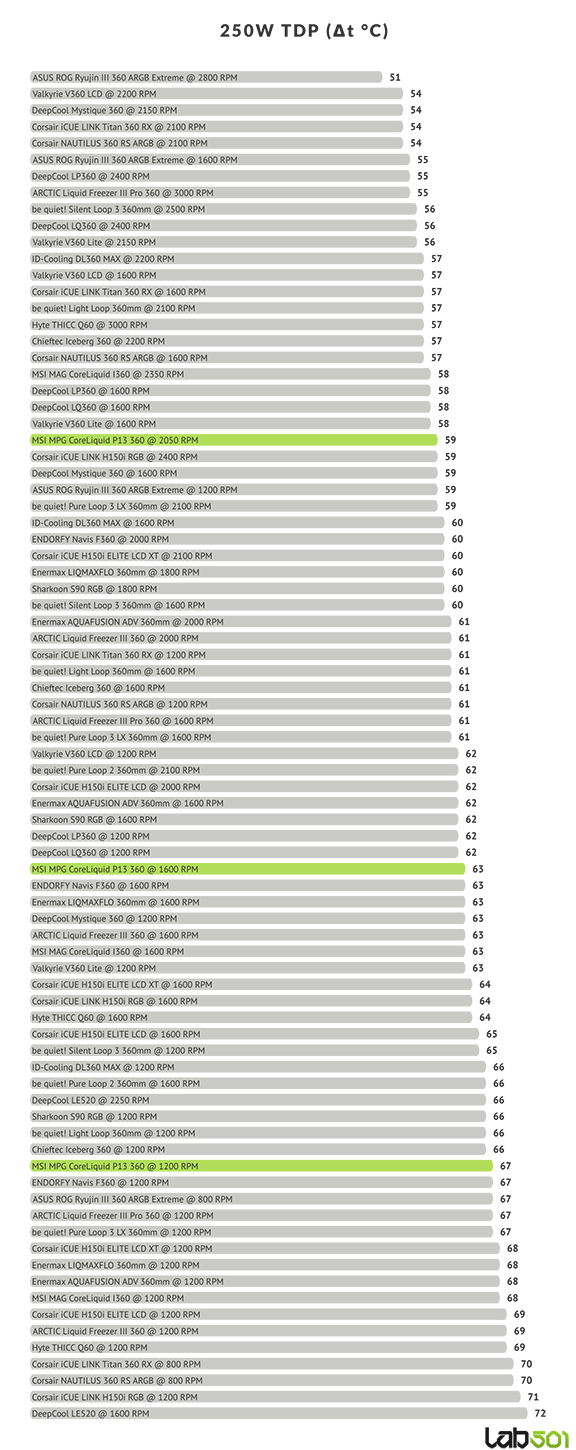 MSI MPG CoreLiquid P13 360 ne arata o performanta similara cu ceea ce am vazut in cazul modelului MAG CoreLiquid I360 testat anterior, existand egalitate perfecta la 1600 RPM. Modelul I360 iese cu 1°C in fata la turatia maxima, avantaj explicat prin turatia mai ridicata a ventilatoarelor (2350 RPM vs 2050 RPM), in timp ce CoreLiquid P13 360 isi adjudeca victoria, tot cu 1°C, la turatia de 1200 RPM, datorita eficientei superioare a ventilatoarelor sale in acest regim.