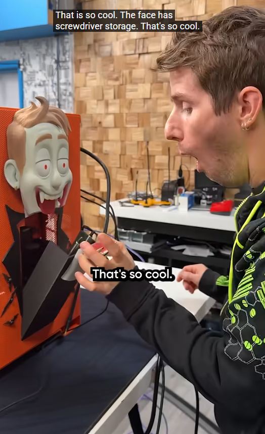 Sistemul este vopsit in tematica de Halloween LTT, cu un atasament neaos romanesc – un Dracula montat pe laterala carcasei, care functioneaza pe post de sertar pentru surubelnita. Desigur, pe langa personalizarea specifica si configuratia ideala pentru un PC de gaming high-end, una dintre cele mai mari realizari mi se pare faptul ca sistemul a ajuns intact din Romania in Canada. In fond, imi aduc aminte cand DHL au jucat fotbal cu sistemul nostru GeForce Garage pe o distanta mult mai scurta (Polonia – Romania).