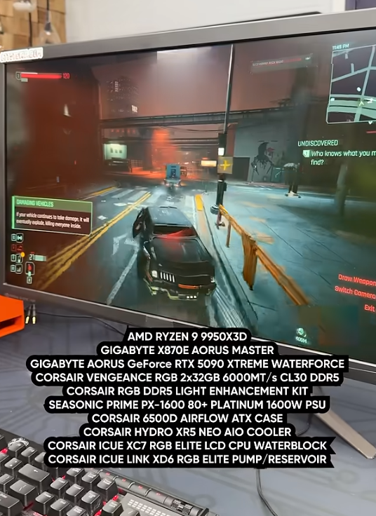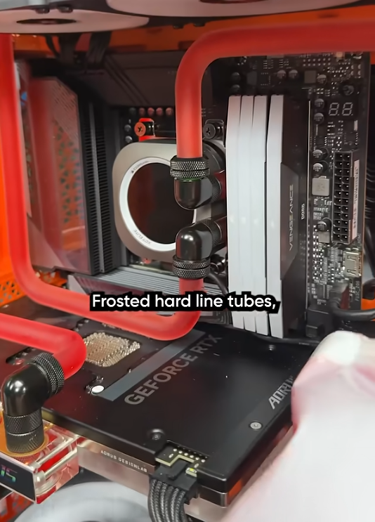 Astfel, sistemul este montat in carcasa Corsair 6500D Airflow, memoriile folosite fiind Corsair Vengeance RGB DDR5 6000 CL30, in configuratie 2 x 32GB. Sistemul de racire este construit folosind componente Corsair, mai precis waterblock-ul Corsair iCUE XC7 RGB Elite LCD, radiatorul Corsair Hydro XR5 Neo si combo-ul pompa + rezervor Corsair iCUE Link XD6 RGB Elite, ITD CustomWorks folosind tubulatura rigida de 12mm.